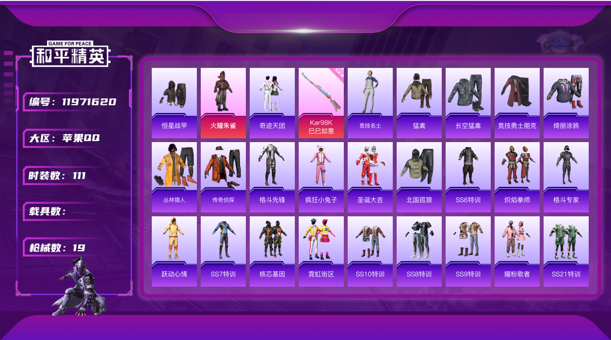 [11971620]1粉装 1特效枪 可二次 可修改实名 优质装备:火曜朱雀,Kar98K-巳巳如意 热门装扮:奇迹天团,恒星战甲 三级特效枪:三级Kar98K-巳巳如意 紫色装扮:SS31特训套装,SS21特训,SS22特训,圣诞大吉,北国孤狼,霓虹街区,跃动心情,长空猛禽,格斗先锋,绮丽涂鸦,竞技勇士朋克,猛禽,疯狂小兔子,竞技名士,核芯基因,SS7特训,SS8特训,SS9特训,炽焰拳师,格斗专家,SS6特训,SS10特训,耀粉歌者,丛林猎人,传奇侦探 优质战备:至尊龙雀降落伞