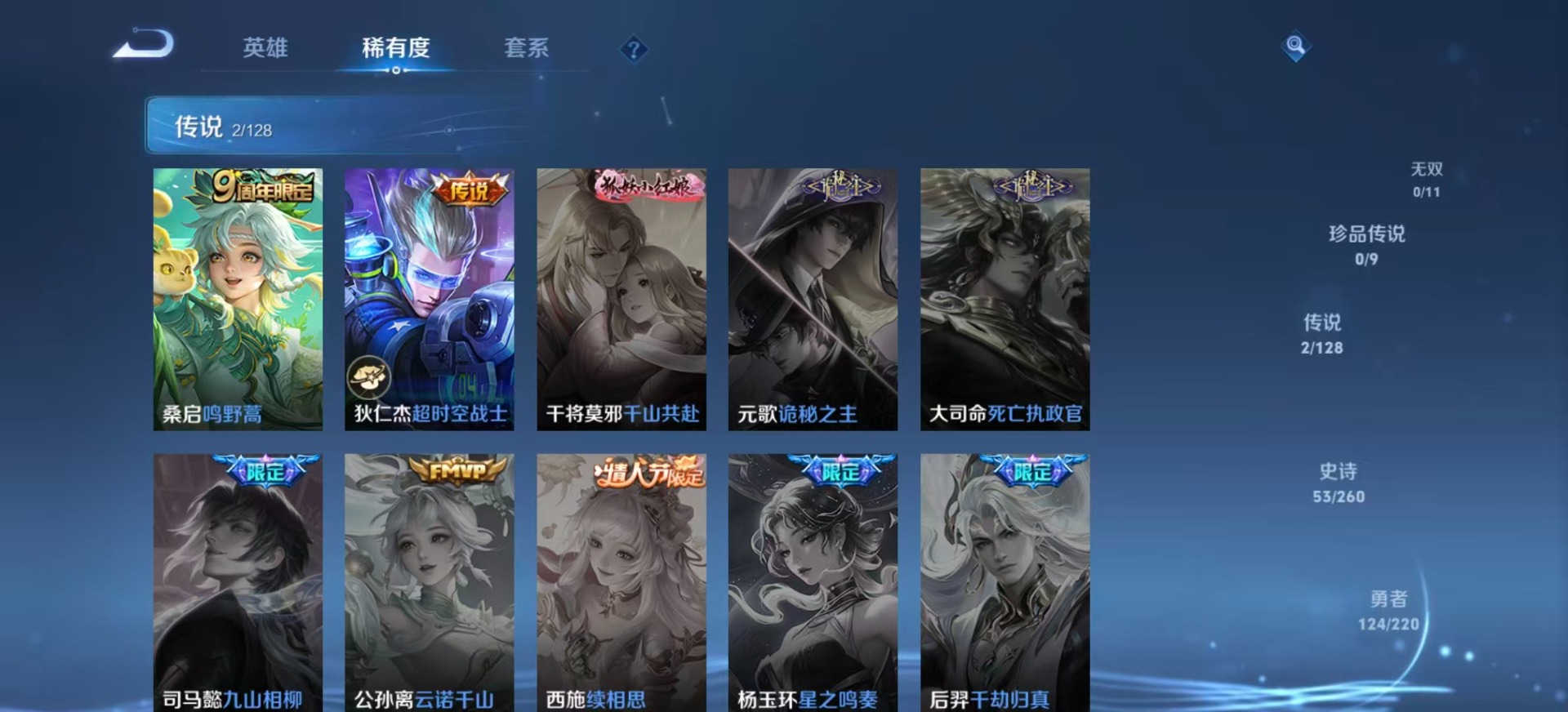 夏侯惇朔风刀,老夫子醍醐杖,沈梦溪大漠名商,盾山御銮,曹操烛龙,苏烈千军破阵,典韦穷奇,达摩沙漠行僧,鲁班七号狮舞东方,兰陵王金庭之子,裴擒虎擒涛扼浪,鲁班大师探海日志,明世隐疑决卦,白起狰,鬼谷子原初探秘者,张良古海寻踪,桑启海盐诗旅,狄仁杰万华元夜,芈月重明,程咬金演武夺筹,扁鹊炼金王,李元芳云中旅人,弈星混沌棋,虞姬凯尔特女王,米莱狄御霄,钟馗神迹守卫,钟馗驱傩正仪,狂铁御狮,太乙真人饕餮