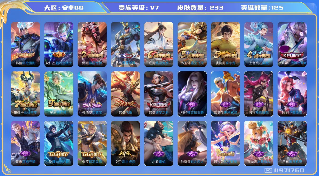 [11971760]V7 1典藏 2传说 125英雄 233皮肤 可修改实名 优质装备:弑枪猎影(韩信典藏),超时空战士-狄仁杰,涂山容容 珍宝阁皮:妄想食味,玩趣恶龙 限定皮:逐霄战戟,鸣野蒿,至尊宝,飞衡(韩信年限),遇见飞天,高山流水,五谷丰年,游园惊梦,梁祝,天狼绘梦者,李小龙,逐梦之影 史诗皮:谪仙醉月,龙之律动,百相守梦-周瑜,破空之剑,百相守梦-黄忠,黄金分割率,特工魅影,千年之狐,江河有灵,百解令(蒙犽),青蛇,偶像歌手,暗夜猫娘,末日机甲-吕布,时之恋人-孙尚香,乱世虎臣,节奏热浪,女仆咖啡,水果甜心,星夜王子,心灵骇客,德古拉伯爵,暗隐猎兽者,鬼剑武藏,纤云弄巧,繁星吟游(呼啦呼啦),乘风破浪,逐浪之夏,水晶猎龙者,曙光守护者,箭羽风息,金属风暴,圣诞恋歌,鹰眼统帅,魅力维加斯,无心,未来纪元-赵云