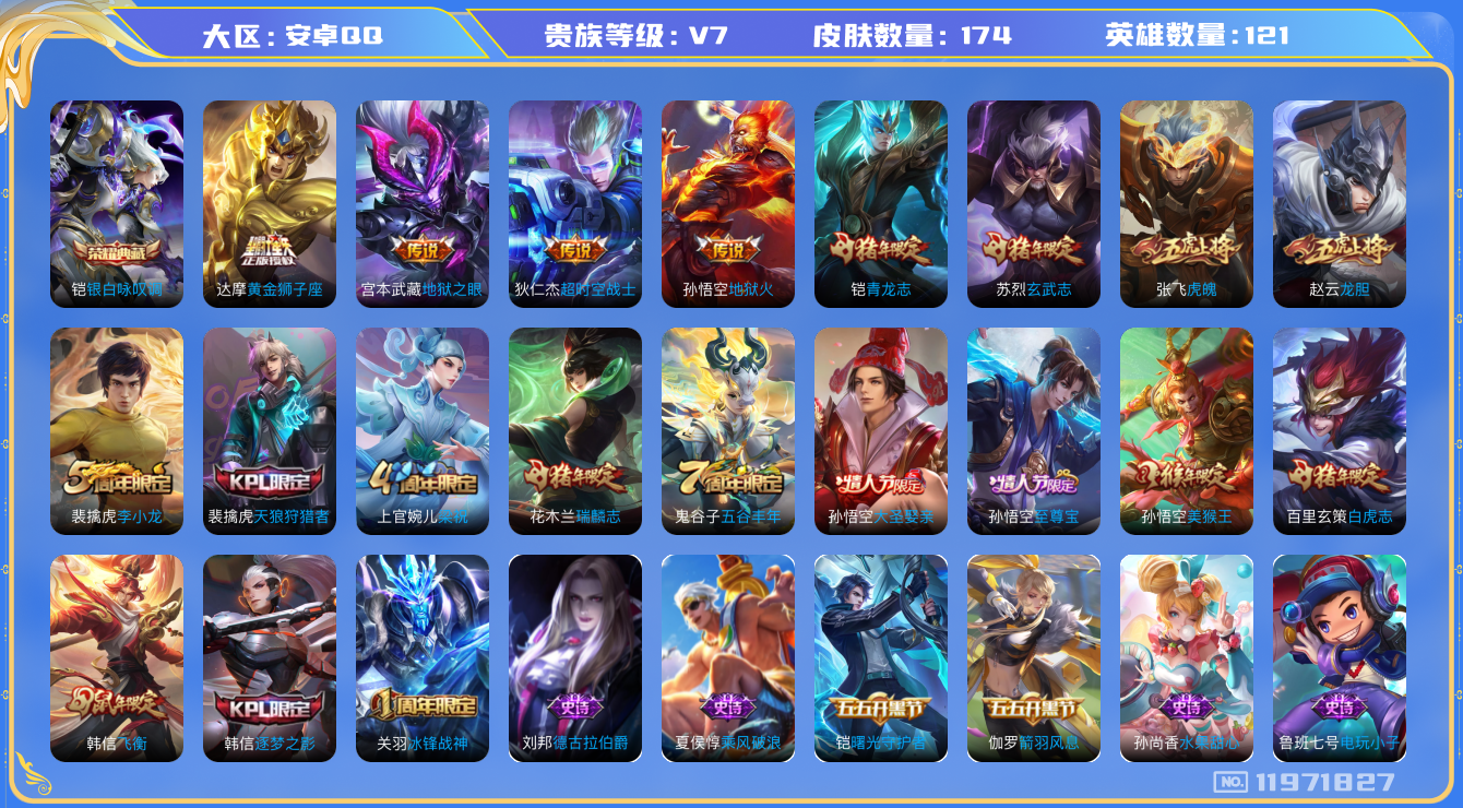 [11971827]V7 1典藏 5传说 121英雄 174皮肤 可修改实名 优质装备:银白咏叹调(倪克斯侍卫),黄金狮子座,地狱火,地狱之眼,超时空战士-狄仁杰 珍宝阁皮:女武神 限定皮:至尊宝,白虎志(电光耗子),飞衡(韩信年限),瑞麟志(木兰年限),五谷丰年,青龙志(铠年限),冰锋战神,梁祝,天狼狩猎者,龙胆,虎魄,李小龙,逐梦之影,玄武志(苏烈年限),大圣娶亲,美猴王 史诗皮:电玩小子(小书包),白龙吟,黄金分割率,特工魅影,千年之狐,水果甜心,绅士熊喵,星夜王子,德古拉伯爵,暗隐猎兽者,心灵战警,乘风破浪,逐浪之夏,水晶猎龙者,曙光守护者,热力回旋,箭羽风息,圣诞狂欢,圣诞恋歌,鹰眼统帅,魅力维加斯,无心,未来纪元-赵云