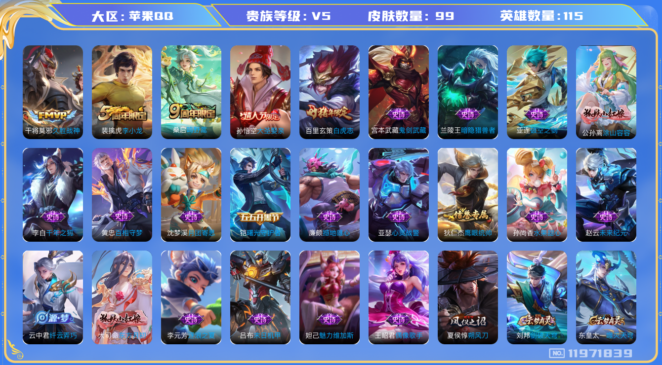 [11971839]V5 3传说 115英雄 99皮肤 可修改实名 优质装备:久胜战神,涂山容容 限定皮:鸣野蒿,白虎志(电光耗子),李小龙,大圣娶亲 史诗皮:撼地雄心,破空之剑,东方月初,百相守梦-黄忠,千年之狐,偶像歌手,末日机甲-吕布,水果甜心,暗隐猎兽者,鬼剑武藏,心灵战警,纤云弄巧,逐浪之夏,月团寄思,曙光守护者,鹰眼统帅,魅力维加斯,未来纪元-赵云