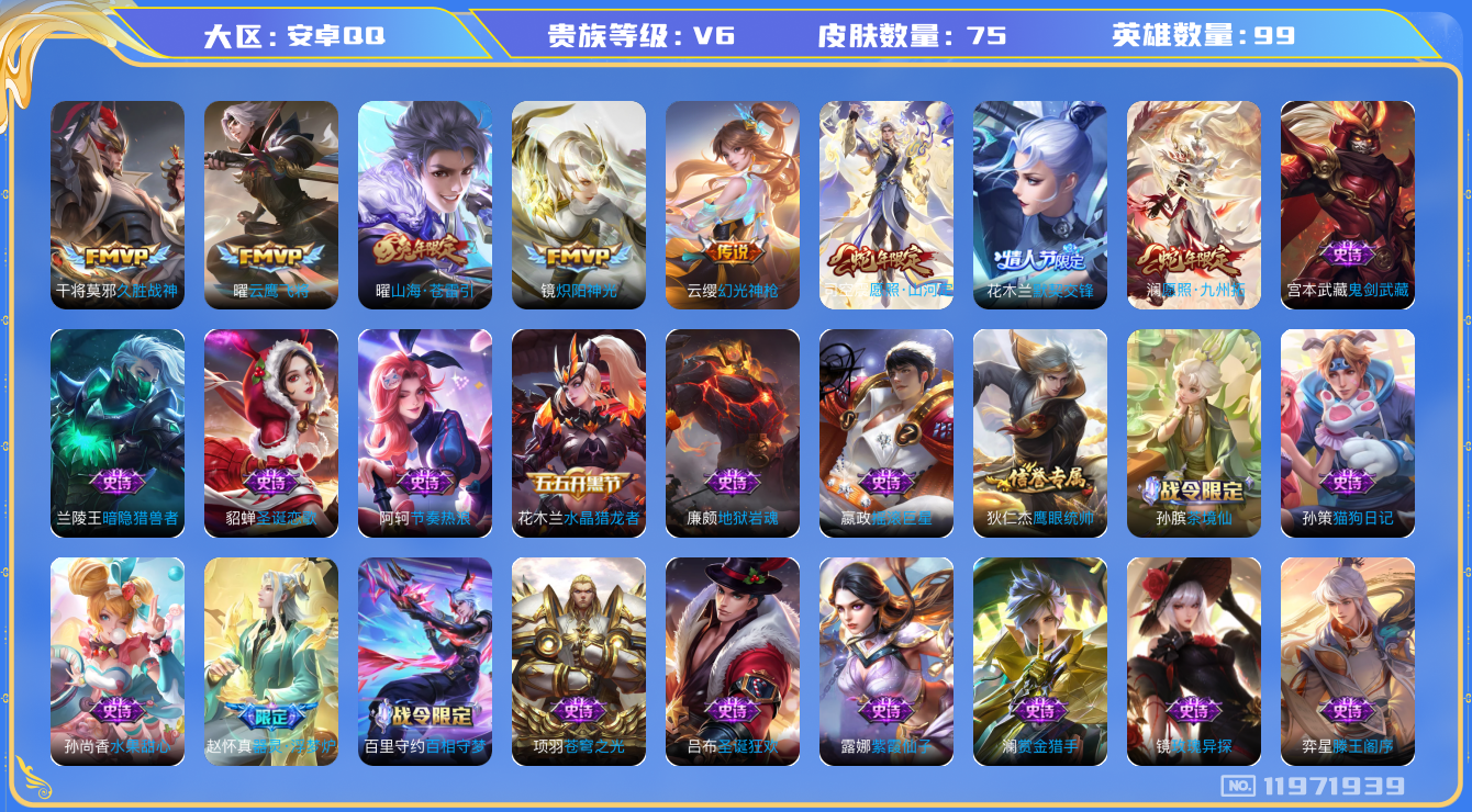 [11971939]V6 7传说 99英雄 75皮肤 可修改实名 优质装备:云鹰飞将(小将军),久胜战神,炽阳神光,山海·苍雷引(电光曜子) 传说皮:幻光神枪 限定皮:愿照·九州拓(澜年限),愿照·山河定(司空震年限),默契交锋-花木兰 史诗皮:器灵·浮梦炉,龙之律动,茶境仙,百相守梦-百里守约,紫霞仙子,苍穹之光,黄金分割率,猫狗日记-孙策,节奏热浪,女仆咖啡,摇滚巨星,水果甜心,天才门将,暗隐猎兽者,鬼剑武藏,地狱岩魂,水晶猎龙者,圣诞狂欢,圣诞恋歌,鹰眼统帅,魅力维加斯,赏金猎手,滕王阁序,玫瑰异探