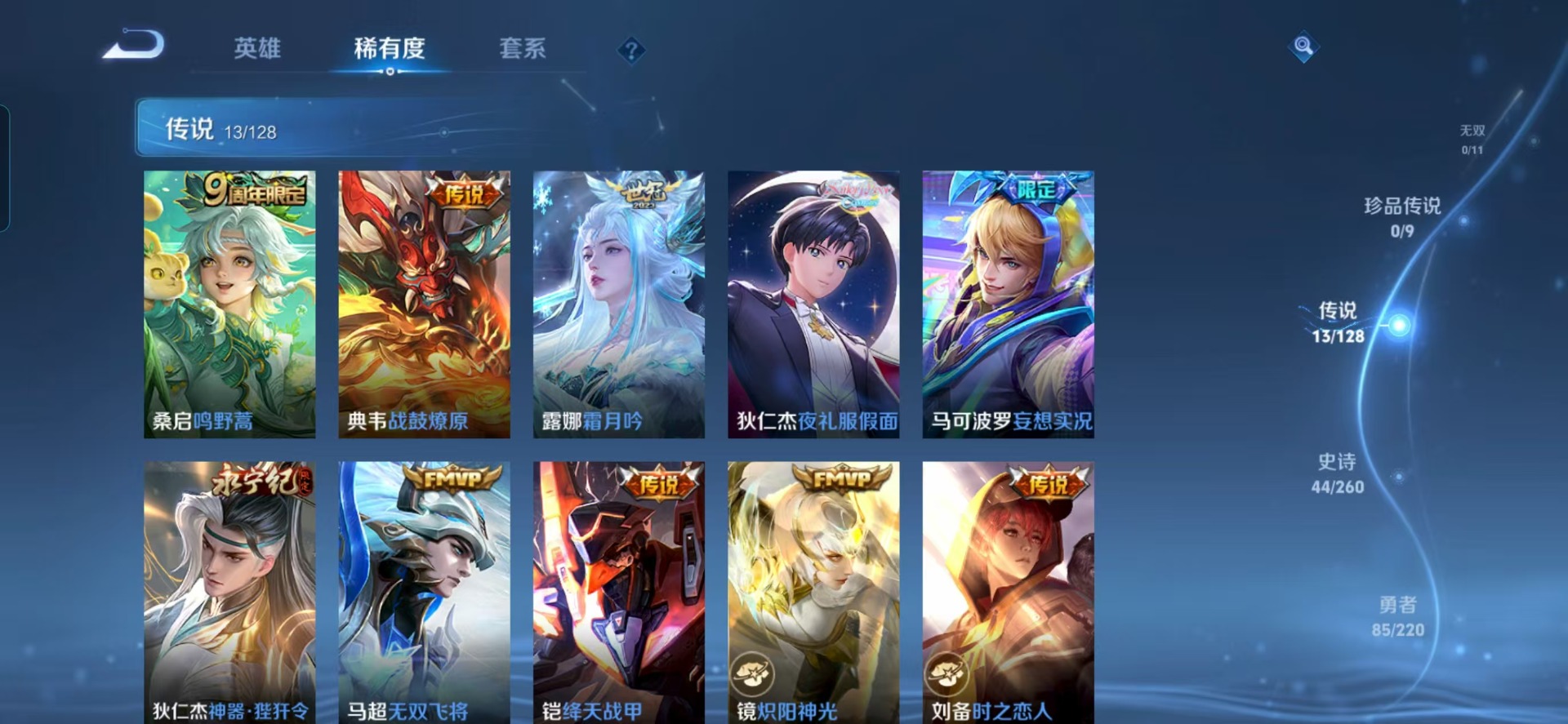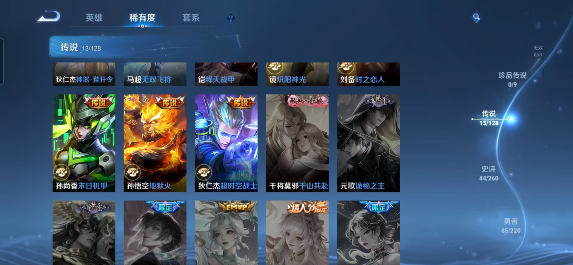- [12022651]V10 2典藏 7传说 125英雄 230皮肤 典藏英雄武则天 可修改实名 优质装备:星空梦想(太空人),全息碎影(猴子典藏),末日机甲-孙尚香(绿蚂蚱),地狱火,仲夏夜之梦(大飞蛾),海洋之心,地狱之眼,艾琳觅芳踪 珍宝阁皮:蔷薇恋人 限定皮:遇见飞天,五谷丰年,梁祝,逐梦之星,李小龙,真爱至上,纯白花嫁,大圣娶亲,引擎之心,青春决赛季,冰霜恋舞曲 史诗皮:苍穹之光,黄金分割率,特工魅影,千年之狐,魅语,冰冠公主,偶像歌手,末日机甲-吕布,女仆咖啡,水果甜心,天才门将,星夜王子,德古拉伯爵,鬼剑武藏,心灵战警,舞动绿茵,地狱岩魂,繁星吟游(呼啦呼啦),乘风破浪,逐浪之夏,水晶猎龙者,曙光守护者,金属风暴,原初追逐者,圣诞狂欢,鹰眼统帅,王者之锤,魅力维加斯,无心,未来纪元-赵云