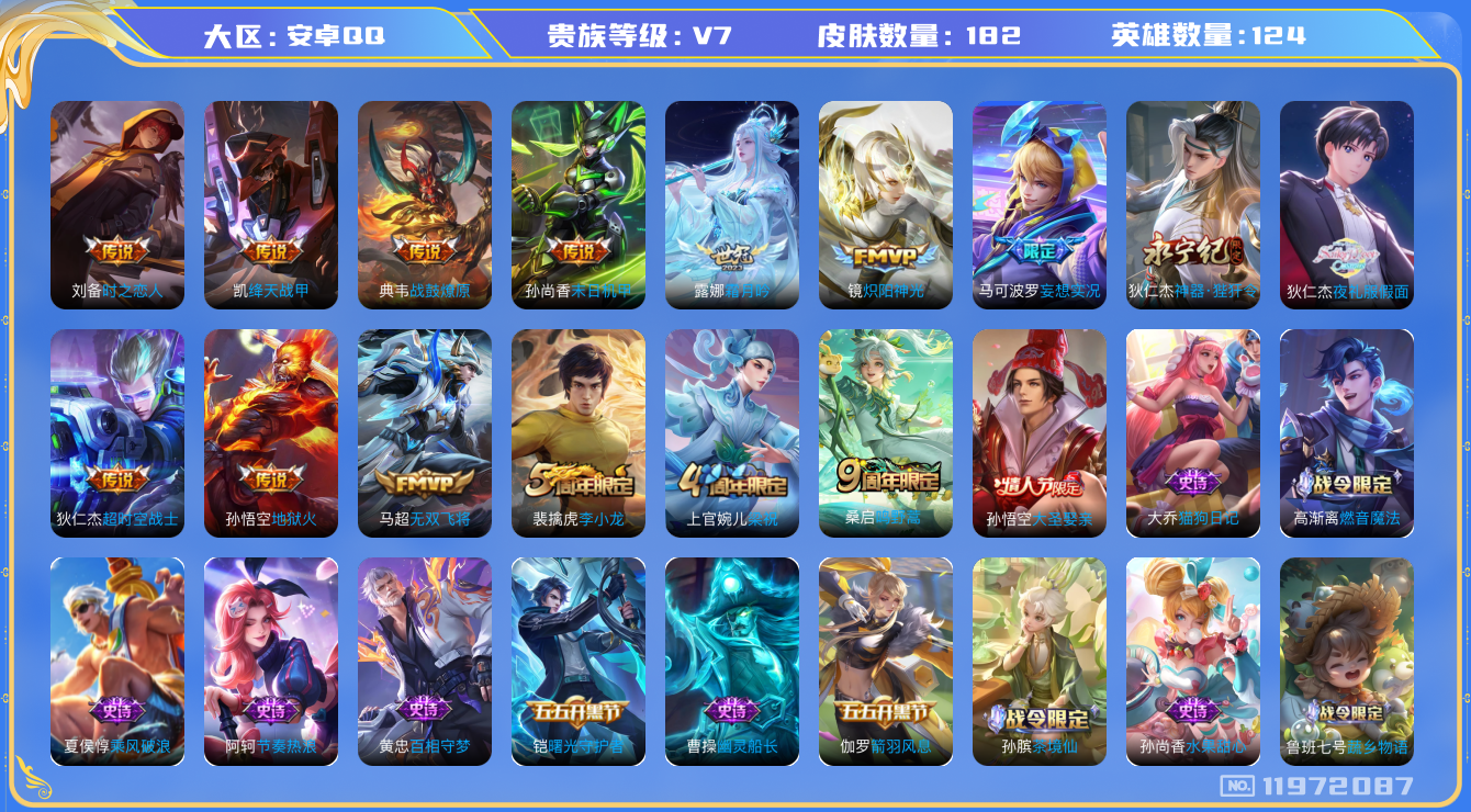 - [11687011]V7 1典藏 8传说 123英雄 178皮肤 可修改实名 优质装备:无限飓风号(高达),云鹰飞将(小将军),炽阳神光,零号·赤焰,黄金天蝎座 传说皮:幻光神枪 珍宝阁皮:妄想食味,蔷薇恋人 限定皮:逐霄战戟,鸣野蒿,至尊宝,凤求凰(白切鸡),五谷丰年,烈魂,岱宗(典韦年限),天狼征服者,逐梦之影,默契交锋-花木兰,天魔缭乱 史诗皮:化蝶舞,破空之剑,海诺心动手记,决胜骁骑,蔬乡物语(鲁班七号),紫霞仙子,黄金分割率,特工魅影,高渐离燃音魔法,蒙恬荣光圣徽,冰冠公主,晚萤,电玩·爆裂旋风,末日机甲-吕布,猫狗日记-孙策,时之恋人-孙尚香,节奏热浪,摇滚巨星,水果甜心,绅士熊喵,星夜王子,心灵骇客,功夫厨神,德古拉伯爵,暗隐猎兽者,幽灵船长,鬼剑武藏,心灵战警,地狱岩魂,繁星吟游(呼啦呼啦),缤纷独角兽,乘风破浪,逐浪之夏,曙光守护者,热力回旋,金属风暴,原初追逐者,圣诞恋歌,鹰眼统帅,魅力维加斯,赏金猎手,未来纪元-赵云