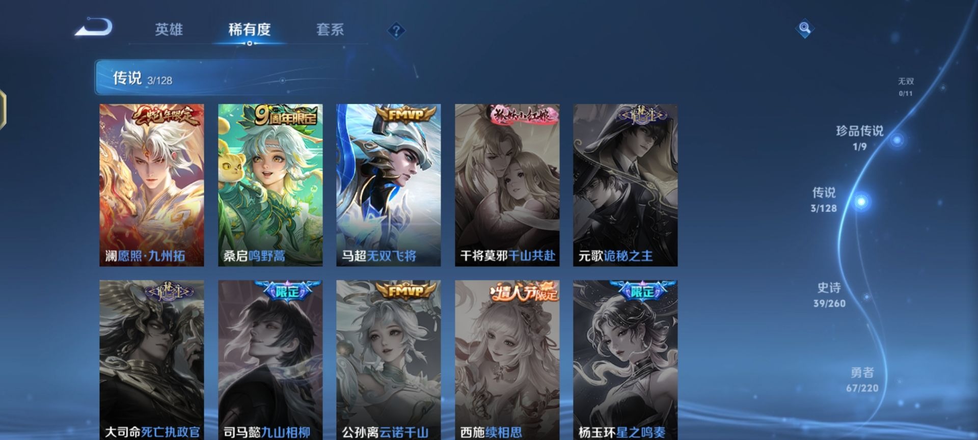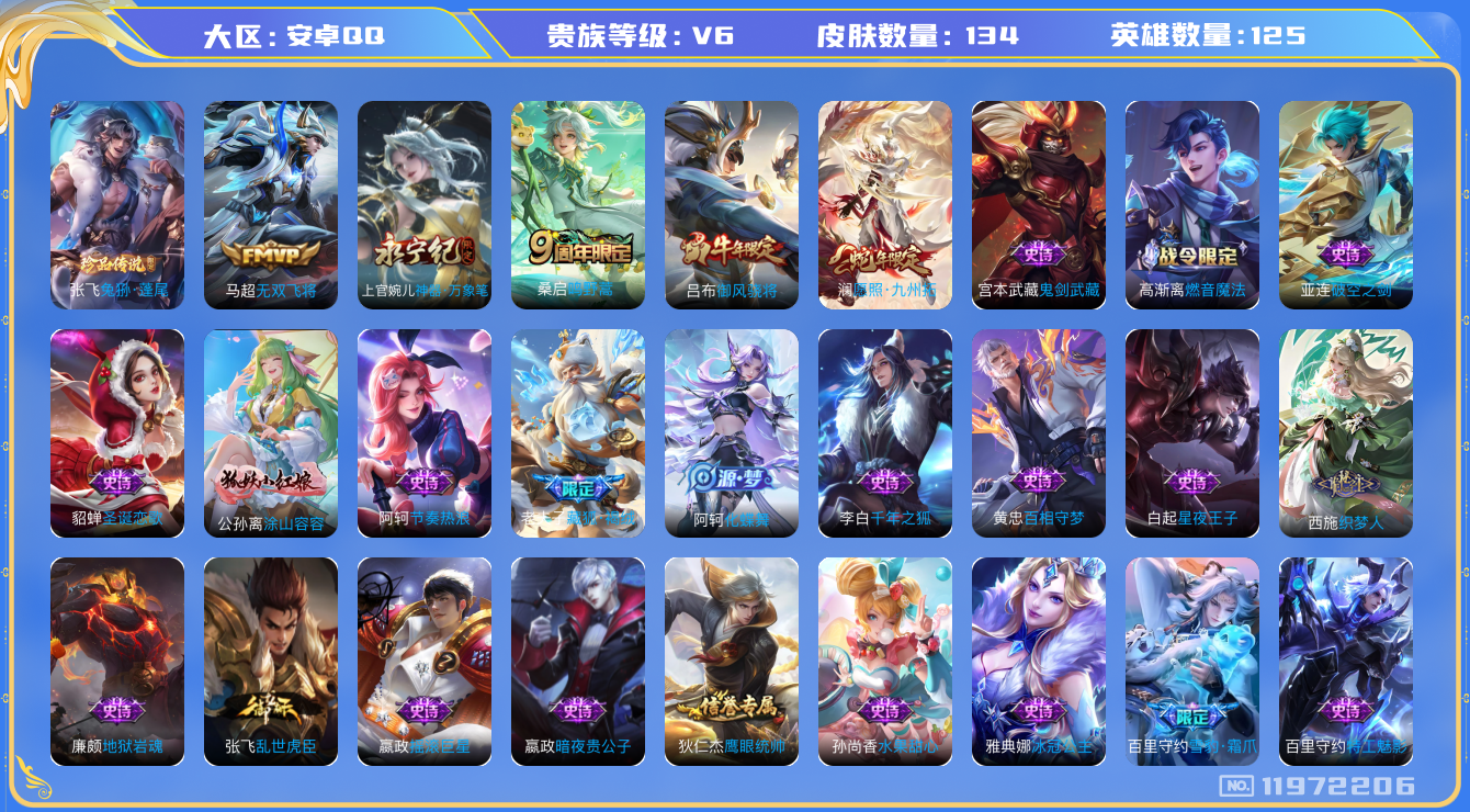 [11972206]V6 1珍品传说 3传说 125英雄 134皮肤 可修改实名 优质装备:无双飞将,涂山容容 珍品传说:兔狲·蓬尾 珍宝阁皮:万物之道 限定皮:愿照·九州拓(澜年限),鸣野蒿,御风骁将(吕布年限),神器·万象笔 史诗皮:化蝶舞,龙之律动,雪豹·霜爪,藏狐·褐绒,破空之剑,涂山红红,东方月初,决胜骁骑,百相守梦-黄忠,织梦人,特工魅影,千年之狐,高渐离燃音魔法,冰冠公主,偶像歌手,乱世虎臣,节奏热浪,摇滚巨星,水果甜心,绅士熊喵,星夜王子,鬼剑武藏,舞动绿茵,地狱岩魂,逐浪之夏,金属风暴,圣诞狂欢,圣诞恋歌,鹰眼统帅,暗夜贵公子,魅力维加斯,无心