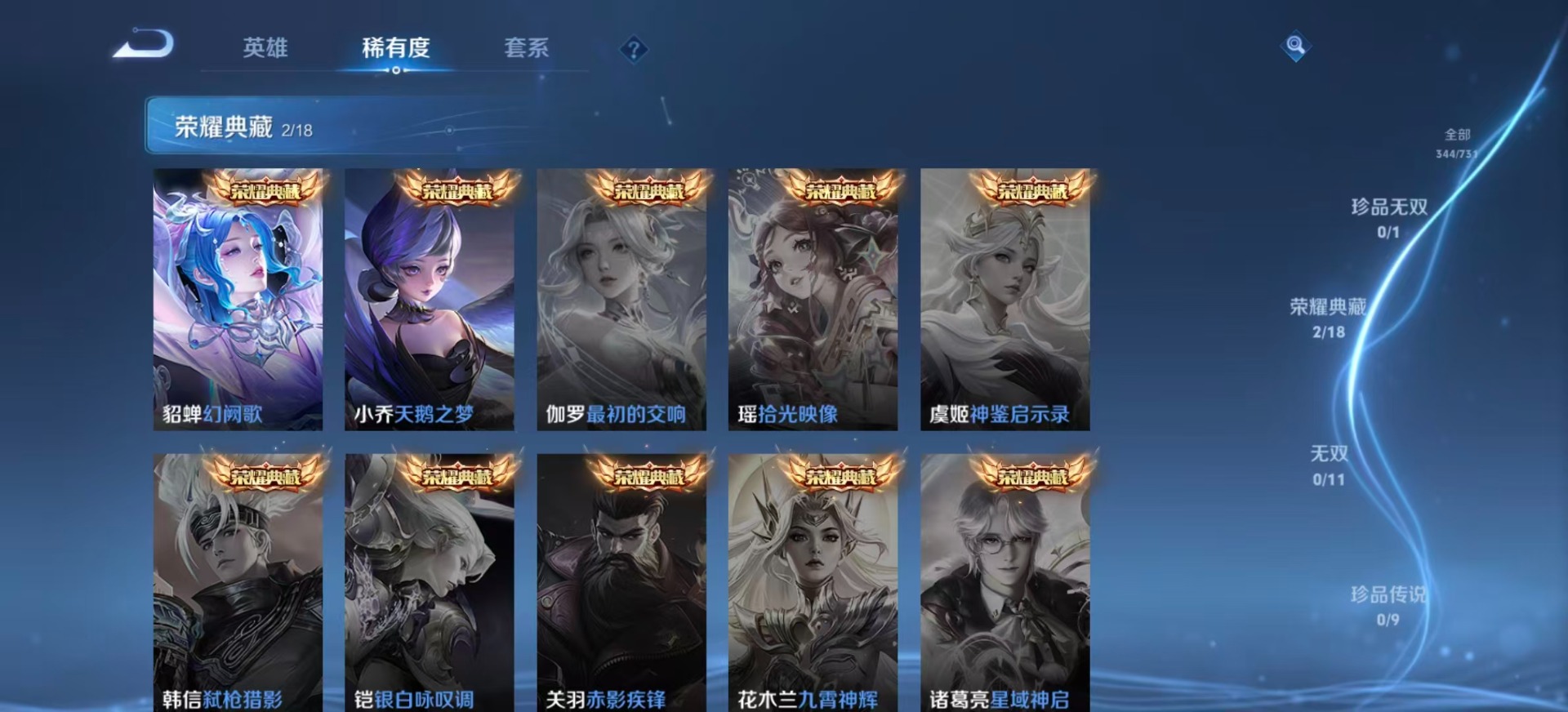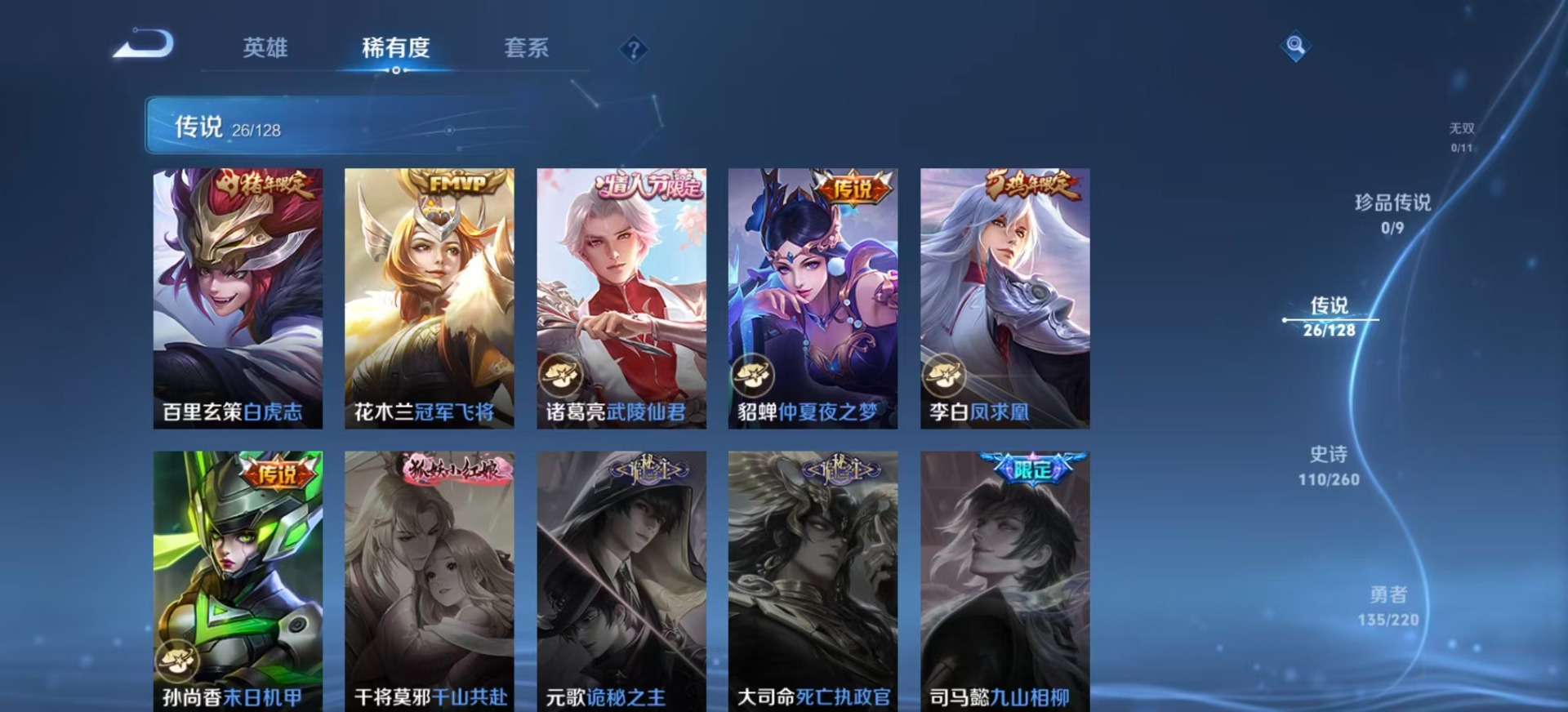 大乔白鹤梁神女,甄姬女儿国国王,伽罗天狼溯光者,伽罗太华,孙膑天狼运算者,干将莫邪冰霜恋舞曲,小乔纯白花嫁,孙尚香异界灵契,后羿如梦令,露娜一生所爱,庄周云端筑梦师,诸葛亮时雨天司,杨玉环寅虎·心曲,公孙离祈雪灵祝,公孙离玉兔公主,公孙离蜜橘之夏,貂蝉逐梦之音,裴擒虎李小龙,东皇太一逐梦之光,上官婉儿梁祝,花木兰默契交锋,花木兰青春决赛季,安琪拉魔法小厨娘,马可波罗逐梦之星,桑启鸣野蒿,猪八戒猪悟能,孙悟空大圣娶亲,芈月白晶晶,孙悟空至尊宝,百里玄策白虎志,赵云引擎之心,妲己时之彼端,韩信逐梦之影,百里守约朱雀志,蔡文姬奇迹圣诞,瑶时之祈愿,瑶山海·碧波行,虞姬霸王别姬,嫦娥如梦令,王昭君凤凰于飞