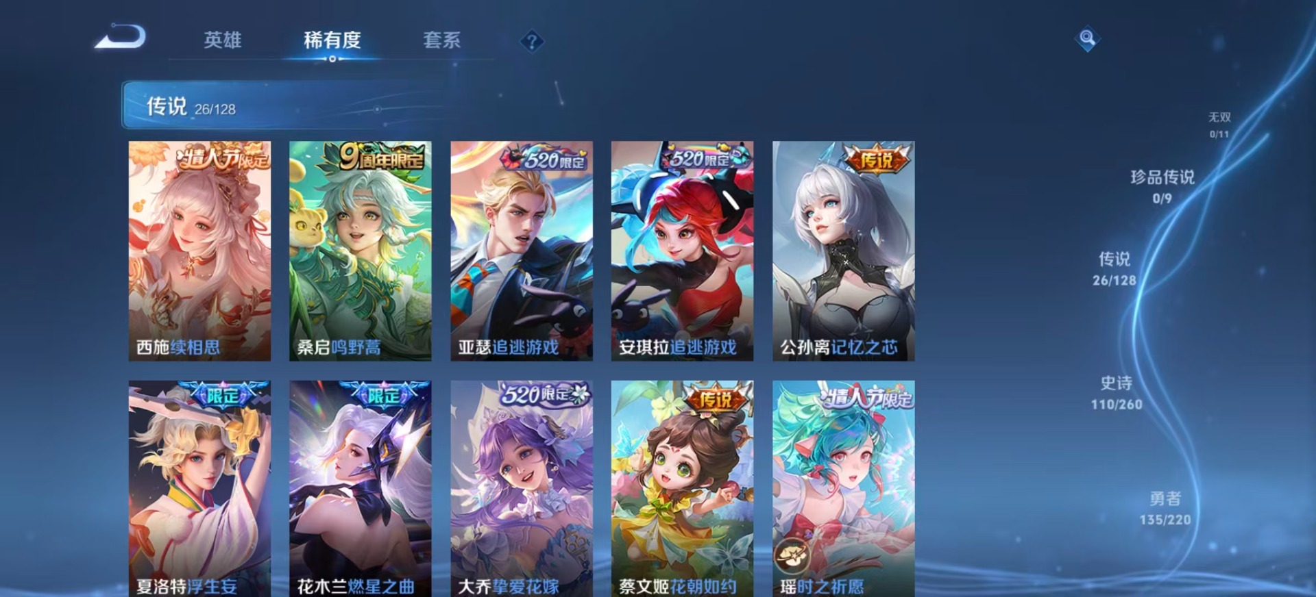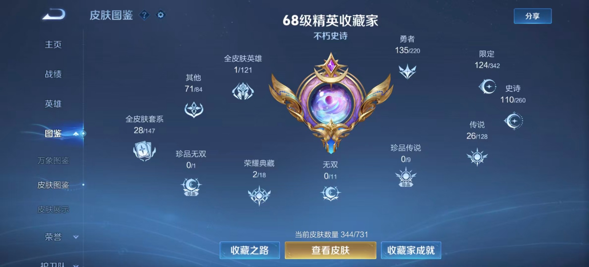 - 苹果微信 不可二次 贵族1 段位永恒钻石II 皮肤价值300118 英雄数量126 皮肤数量407 荣耀水晶2 传说皮肤29 珍品2 限定皮肤48 无双皮肤1 内测3 赛季皮肤31 史诗皮肤51 普通皮肤47 其他310