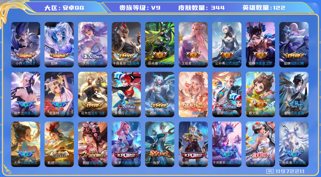 [11972211]V9 2典藏 26传说 122英雄 344皮肤 可修改实名 女号 优质装备:天鹅之梦(小乔典藏),幻阙歌(貂蝉典藏),冠军飞将,猫影幻舞,久胜战神,云霓雀翎,末日机甲-孙尚香(绿蚂蚱),仲夏夜之梦(大飞蛾),乞巧织情,游龙清影(小青龙),花朝如约(花篮子),挚爱花嫁,燃星之曲,浮生妄,记忆之芯(机甲兔),追逃游戏(亚瑟),追逃游戏(安琪拉) 传说皮:续相思 珍宝阁皮:妄想食味,优雅恋人,蔷薇恋人,玩趣恶龙 限定皮:鸣野蒿,至尊宝,白虎志(电光耗子),凤求凰(白切鸡),凤凰于飞,太华(伽罗年限),武陵仙君(小桃花),异界灵契(白毛香),时之彼端,白鹤梁神女,魔法小厨娘,白晶晶,时雨天司(水龙头),山海·碧波行(瑶年限),遇见飞天,高山流水,五谷丰年,天狼运算者,游园惊梦,梁祝,逐梦之星,天狼溯光者,逐梦之音,祈雪灵祝(雪兔子),李小龙,逐梦之影,逐梦之光,朱雀志(守约年限),如梦令-嫦娥,如梦令-后羿,霸王别姬-虞姬,奇迹圣诞,默契交锋-花木兰,纯白花嫁,猪悟能,一生所爱,大圣娶亲,引擎之心,青春决赛季,冰霜恋舞曲,云端筑梦师,蜜橘之夏,女儿国国王,寅虎·心曲(虎婆),时之祈愿-瑶(瑶传限),玉兔公主 史诗皮:蒙犽顽岩魄,遇见神鹿,紫霞仙子,电玩小子(小书包),黄金分割率,特工魅影,千年之狐,江河有灵,雪夜绮愿(周瑜),魅语,蒙恬荣光圣徽,无限星赏官,匿光破解者,冰冠公主,青蛇,偶像歌手,白蛇,电玩·爆裂旋风,末日机甲-吕布,猫狗日记-孙策,猫狗日记-大乔,时之恋人-孙尚香,乱世虎臣,节奏热浪,女仆咖啡,摇滚巨星,水果甜心,绅士熊喵,天才门将,星夜王子,心灵骇客,时之奇旅-安琪拉,功夫厨神,德古拉伯爵,暗隐猎兽者,幽灵船长,鬼剑武藏,心灵战警,舞动绿茵,地狱岩魂,诗语江南,拒霜思,缤纷独角兽,乘风破浪,逐浪之夏,水晶猎龙者,曙光守护者,箭羽风息,金属风暴,原初追逐者,圣诞狂欢,圣诞恋歌,鹰眼统帅,暗夜贵公子,魅力维加斯,黎明之约,奇遇舞章,未来纪元-赵云