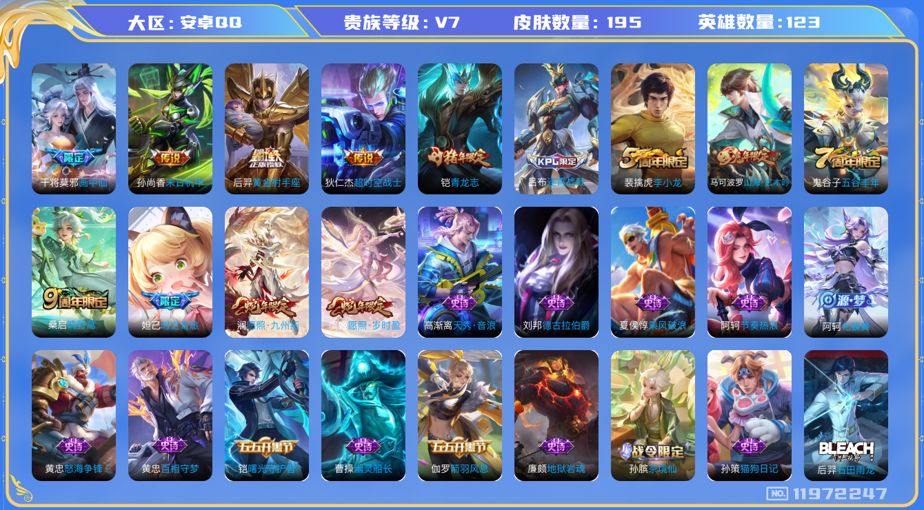 [11972247]V7 7传说 123英雄 195皮肤 可修改实名 优质装备:黄金射手座,末日机甲-孙尚香(绿蚂蚱),超时空战士-狄仁杰,画中仙 珍宝阁皮:蔷薇恋人,女武神 限定皮:愿照·九州拓(澜年限),愿照·岁时盈(虞姬年限),逐霄战戟,鸣野蒿,五谷丰年,青龙志(铠年限),李小龙,时之奇旅-妲己,山海·玄木吟(马可年限) 史诗皮:鸭鸭历险记-刘禅,化蝶舞,星界战将,龙之律动,雪豹·霜爪,石田雨龙,百相守梦-周瑜,茶境仙,怒海争锋,蒙犽顽岩魄,蔬乡物语(鲁班七号),百相守梦-百里守约,百相守梦-黄忠,特工魅影,蒙恬荣光圣徽,电玩·爆裂旋风,末日机甲-吕布,猫狗日记-孙策,节奏热浪,修罗,女仆咖啡,摇滚巨星,星夜王子,德古拉伯爵,幽灵船长,鬼剑武藏,地狱岩魂,乘风破浪,逐浪之夏,龙鼓争鸣,曙光守护者,箭羽风息,金属风暴,原初追逐者,圣诞恋歌,鹰眼统帅,魅力维加斯,奇遇舞章,天秀·音浪,无心,未来纪元-赵云