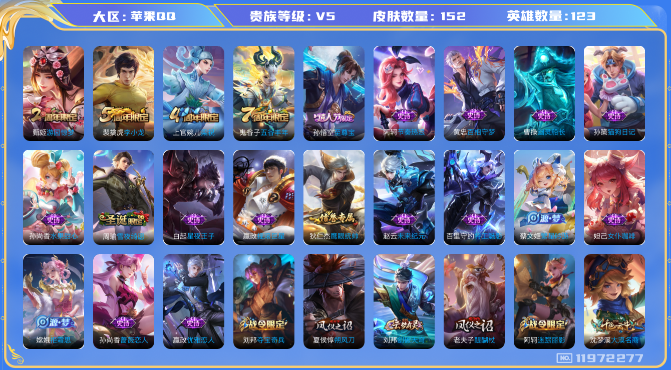 [11972277]V5 123英雄 152皮肤 可修改实名 珍宝阁皮:优雅恋人,蔷薇恋人 限定皮:至尊宝,五谷丰年,游园惊梦,梁祝,李小龙 史诗皮:百相守梦-黄忠,特工魅影,雪夜绮愿(周瑜),猫狗日记-孙策,节奏热浪,女仆咖啡,摇滚巨星,水果甜心,星夜王子,幽灵船长,繁星吟游(呼啦呼啦),拒霜思,鹰眼统帅,未来纪元-赵云