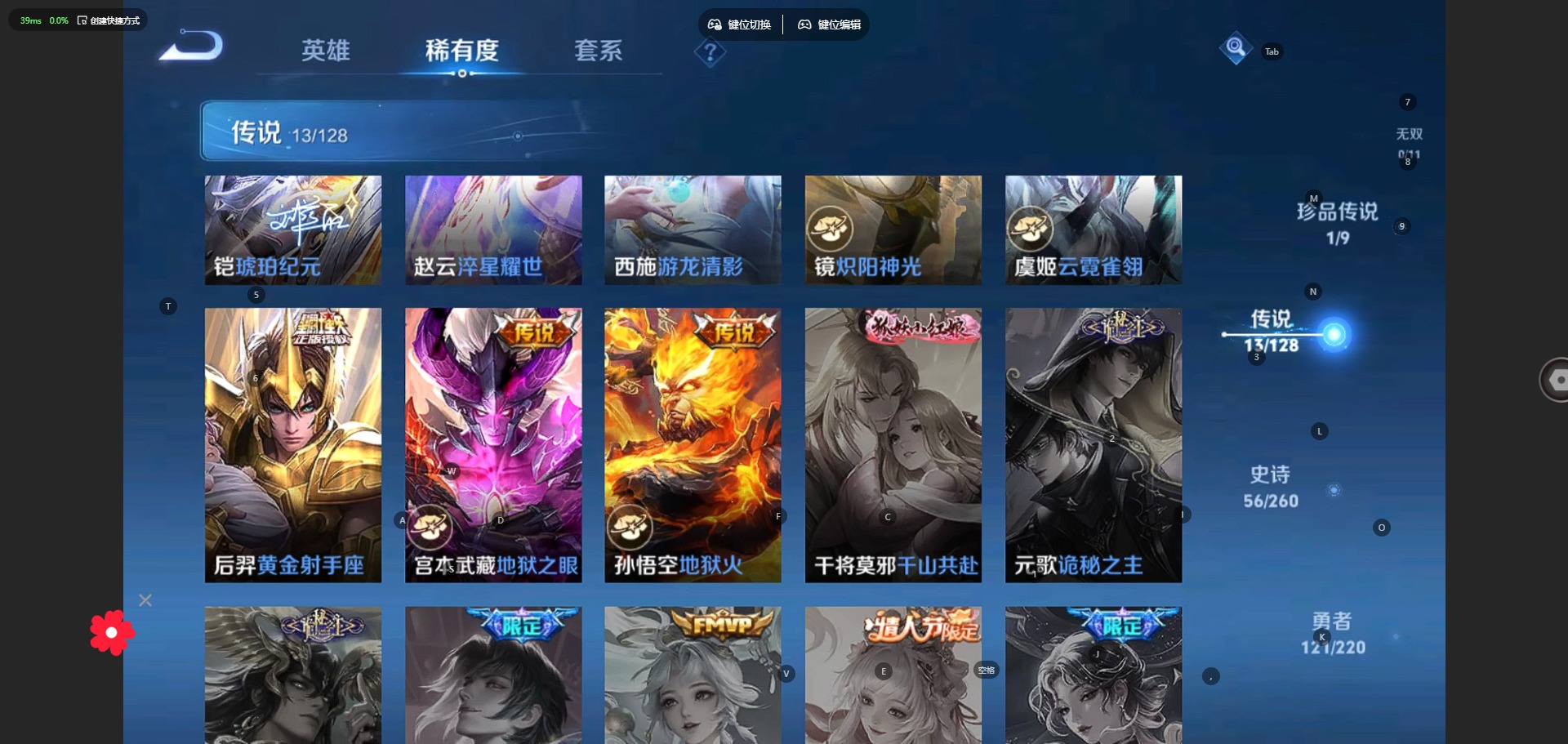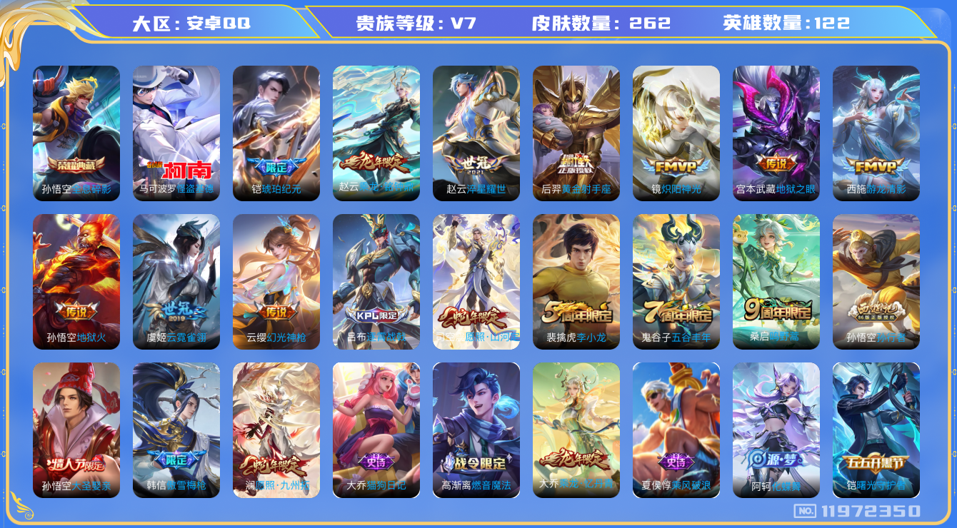 [11972350]V7 1典藏 1珍品传说 13传说 122英雄 262皮肤 可修改实名 优质装备:全息碎影(猴子典藏),怪盗基德,黄金射手座,炽阳神光,云霓雀翎,地狱火,地狱之眼,游龙清影(小青龙),淬星耀世,琥珀纪元铠 传说皮:乘龙·铭钟鼎(赵云年限),幻光神枪 珍宝阁皮:妄想食味,胡桃夹子 限定皮:愿照·九州拓(澜年限),愿照·山河定(司空震年限),逐霄战戟,鸣野蒿,傲雪梅枪,五谷丰年,李小龙,孙行者,大圣娶亲 史诗皮:鸭鸭历险记-刘禅,化蝶舞,龙之律动,茶境仙,破空之剑,东方月初,蒙犽顽岩魄,蔬乡物语(鲁班七号),乘龙·聚宝船(安琪拉年限),乘龙·忆丹青(大乔年限),紫霞仙子,特工魅影,永昼,江河有灵,魅语,百解令(蒙犽),高渐离燃音魔法,无限星赏官,冰冠公主,青蛇,偶像歌手,末日机甲-吕布,猫狗日记-孙策,猫狗日记-大乔,女仆咖啡,摇滚巨星,水果甜心,天才门将,功夫厨神,幽灵船长,鬼剑武藏,心灵战警,地狱岩魂,纤云弄巧,拒霜思,乘风破浪,逐浪之夏,水晶猎龙者,曙光守护者,原初追逐者,圣诞恋歌,鹰眼统帅,魅力维加斯,赏金猎手,未来纪元-赵云