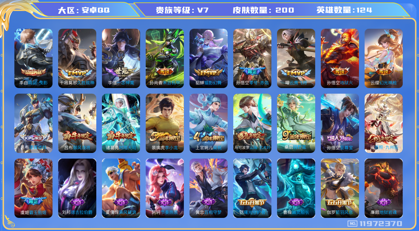 [11972370]V7 1典藏 11传说 124英雄 200皮肤 可修改实名 优质装备:鸣剑·曳影,云鹰飞将(小将军),猫影幻舞,久胜战神,一念神魔,末日机甲-孙尚香(绿蚂蚱),地狱火,零号·赤焰,涂山容容 传说皮:幻光神枪 珍宝阁皮:妄想食味,女武神,玩趣恶龙 限定皮:愿照·九州拓(澜年限),逐霄战戟,鸣野蒿,至尊宝,时雨天司(水龙头),梁祝,御风骁将(吕布年限),李小龙,霸王别姬-虞姬,山海·玄木吟(马可年限) 史诗皮:器灵·浮梦炉,星界战将,龙之律动,茶境仙,蒙犽顽岩魄,百相守梦-黄忠,织梦人,白龙吟,黄金分割率,特工魅影,千年之狐,江河有灵,蒙恬荣光圣徽,无限星赏官,偶像歌手,猫狗日记-孙策,时之恋人-孙尚香,节奏热浪,修罗,女仆咖啡,摇滚巨星,水果甜心,天才门将,星夜王子,功夫厨神,德古拉伯爵,暗隐猎兽者,幽灵船长,鬼剑武藏,心灵战警,地狱岩魂,纤云弄巧,拒霜思,乘风破浪,逐浪之夏,水晶猎龙者,曙光守护者,箭羽风息,金属风暴,圣诞恋歌,鹰眼统帅,魅力维加斯,赏金猎手,未来纪元-赵云