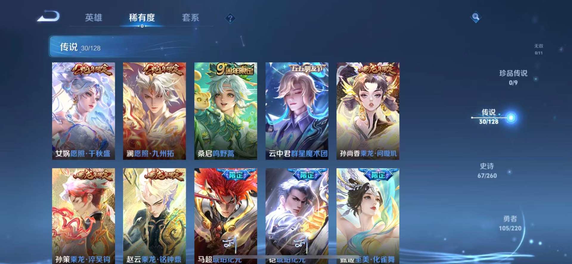 大乔乘龙·忆丹青,夏侯惇乘风破浪,阿轲节奏热浪,沈梦溪匿光破解者,刘备百相守梦,廉颇地狱岩魂,伽罗琥珀纪元,小乔缤纷独角兽,孙尚香时之恋人,孙策猫狗日记,不知火舞魅语,鲁班七号电玩小子,吕布圣诞狂欢,露娜紫霞仙子,吕布末日机甲,诸葛亮黄金分割率,刘禅天才门将,宫本武藏鬼剑武藏,兰陵王暗隐猎兽者,李白谪仙醉月,花木兰水晶猎龙者,上官婉儿群星魔术团,蒙犽龙鼓争鸣,安琪拉乘龙·聚宝船,白起星夜王子,亚瑟心灵战警,程咬金功夫厨神,百里玄策热力回旋,百里守约特工魅影,墨子金属风暴,澜赏金猎手,娜可露露晚萤,钟馗乐园奇幻夜,橘右京修罗