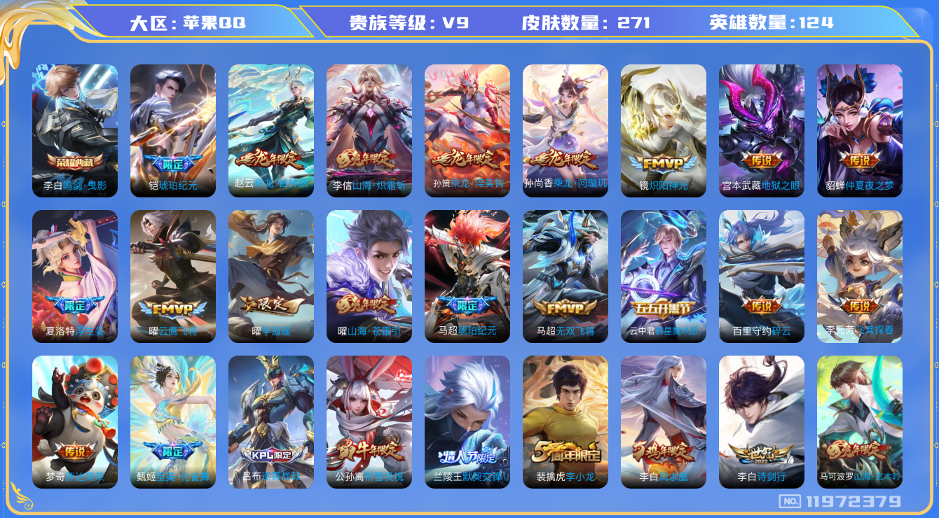 [11972379]V9 1典藏 30传说 124英雄 271皮肤 可修改实名 女号 优质装备:鸣剑·曳影,云鹰飞将(小将军),炽阳神光,仲夏夜之梦(大飞蛾),地狱之眼,飞鸢探春,胖达荣荣,李逍遥,无双飞将,碎云,山海·炽霜斩(李信年限),山海·苍雷引(电光曜子),浮生妄,琥珀纪元铠,琥珀纪元马超,云中君群星魔术团 传说皮:乘龙·问璇玑(孙尚香年限),乘龙·铭钟鼎(赵云年限),乘龙·淬吴钩(孙策年限) 珍宝阁皮:胡桃夹子 限定皮:愿照·九州拓(澜年限),愿照·千秋盛(女娲年限),逐霄战戟,陌上桑,鸣野蒿,凤求凰(白切鸡),傲雪梅枪,白晶晶,至美·乘鲤谣,至美·化雀舞,诗剑行,无限倾心-虞姬,齐天大圣,五谷丰年,祈雪灵祝(雪兔子),李小龙,默契交锋-兰陵王,时之祈愿-云中君,深海之息(深海大菠萝),山海·玄木吟(马可年限) 史诗皮:鸭鸭历险记-刘禅,化蝶舞,谪仙醉月,龙之律动,茶境仙,破空之剑,涂山红红,东方月初,琥珀纪元伽罗,上官婉儿群星魔术团,蔬乡物语(鲁班七号),超元猎域,乘龙·聚宝船(安琪拉年限),乘龙·忆丹青(大乔年限),百相守梦-黄忠,紫霞仙子,电玩小子(小书包),黄金分割率,特工魅影,江河有灵,魅语,匿光破解者,晚萤,百相守梦(刘备),末日机甲-吕布,猫狗日记-孙策,时之恋人-孙尚香,乱世虎臣,节奏热浪,修罗,水果甜心,天才门将,星夜王子,功夫厨神,暗隐猎兽者,鬼剑武藏,心灵战警,乐园奇幻夜,地狱岩魂,缤纷独角兽,乘风破浪,龙鼓争鸣,水晶猎龙者,热力回旋,金属风暴,圣诞狂欢,鹰眼统帅,魅力维加斯,赏金猎手
