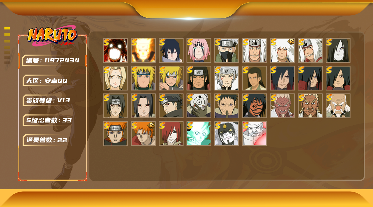 [11972434]V13 33S忍 61A忍 22通灵 1536W战力 可二次 可修改实名 优质装备:熊猫,千手柱间「秽土转生」,宇智波鼬「秽土转生」,佩恩·天道「超」,宇智波斑「秽土转生」,波风水门「秽土转生」,长门「秽土转生」,宇智波斑,艾「四代目雷影」,千手扉间,宇智波带土 「忍界大战」,“宇智波斑” 「白面具」,漩涡鸣人 「九喇嘛连结」,大筒木金式「博人传」,春野樱 「忍界大战」,神秘面具男 「红夜之刃」,宇智波佐助「永恒万花筒」,千手柱间·木叶创立,宇智波斑「秽土转生·解」,大筒木桃式,艾「忍界大战」,宇智波止水「须佐能乎」,旗木卡卡西「须佐能乎」,大筒木舍人 「最终章」,自来也 「传说中的三忍」,漩涡鸣人 「暴怒·第六尾」 S级忍者:大野木 「忍界大战」,自来也 「舞之豪杰」,宇智波鼬 「须佐能乎」,佩恩「天道」,波风水门,大蛇丸,自来也,纲手