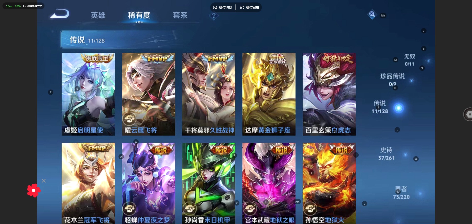 - [12321065]V7 8传说 122英雄 134皮肤 可修改实名 嬴政大国标 关羽小国标 苍小国标 优质装备:冠军飞将,云鹰飞将(小将军) 传说皮:乘龙·铭钟鼎(赵云年限),乘龙·淬吴钩(孙策年限),落雪白狼 珍宝阁皮:优雅恋人 限定皮:逐霄战戟,鸣野蒿,白虎志(电光耗子),白鹤梁神女,遇见飞天,武圣,梁祝,李小龙 史诗皮:怒海争锋,决胜骁骑,特工魅影,千年之狐,江河有灵,龙骑士(小龙虾),乱世虎臣,修罗,摇滚巨星,水果甜心,鬼剑武藏,缤纷独角兽,月团寄思,原初追逐者,鹰眼统帅,暗夜贵公子,魅力维加斯,黎明之约