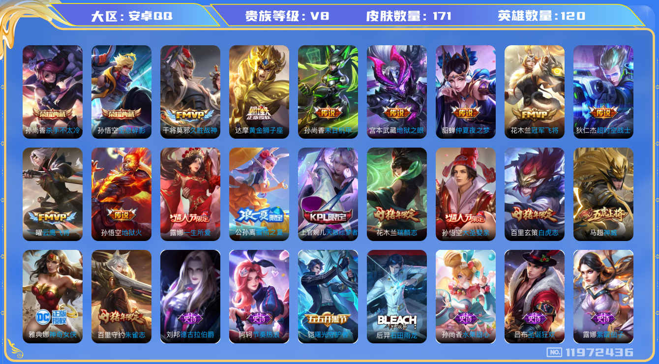 [11972436]V8 2典藏 11传说 120英雄 171皮肤 可修改实名 优质装备:杀手不太冷,全息碎影(猴子典藏),黄金狮子座,冠军飞将,云鹰飞将(小将军),久胜战神,末日机甲-孙尚香(绿蚂蚱),地狱火,仲夏夜之梦(大飞蛾),地狱之眼,超时空战士-狄仁杰,涂山容容 珍宝阁皮:玩趣恶龙 限定皮:白虎志(电光耗子),神威(电光马子),瑞麟志(木兰年限),天狼绘梦者,朱雀志(守约年限),一生所爱,大圣娶亲,蜜橘之夏,神奇女侠 史诗皮:石田雨龙,紫霞仙子,白龙吟,黄金分割率,千年之狐,冰冠公主,偶像歌手,末日机甲-吕布,节奏热浪,女仆咖啡,水果甜心,星夜王子,德古拉伯爵,心灵战警,繁星吟游(呼啦呼啦),逐浪之夏,曙光守护者,原初追逐者,圣诞狂欢,鹰眼统帅,魅力维加斯,未来纪元-赵云