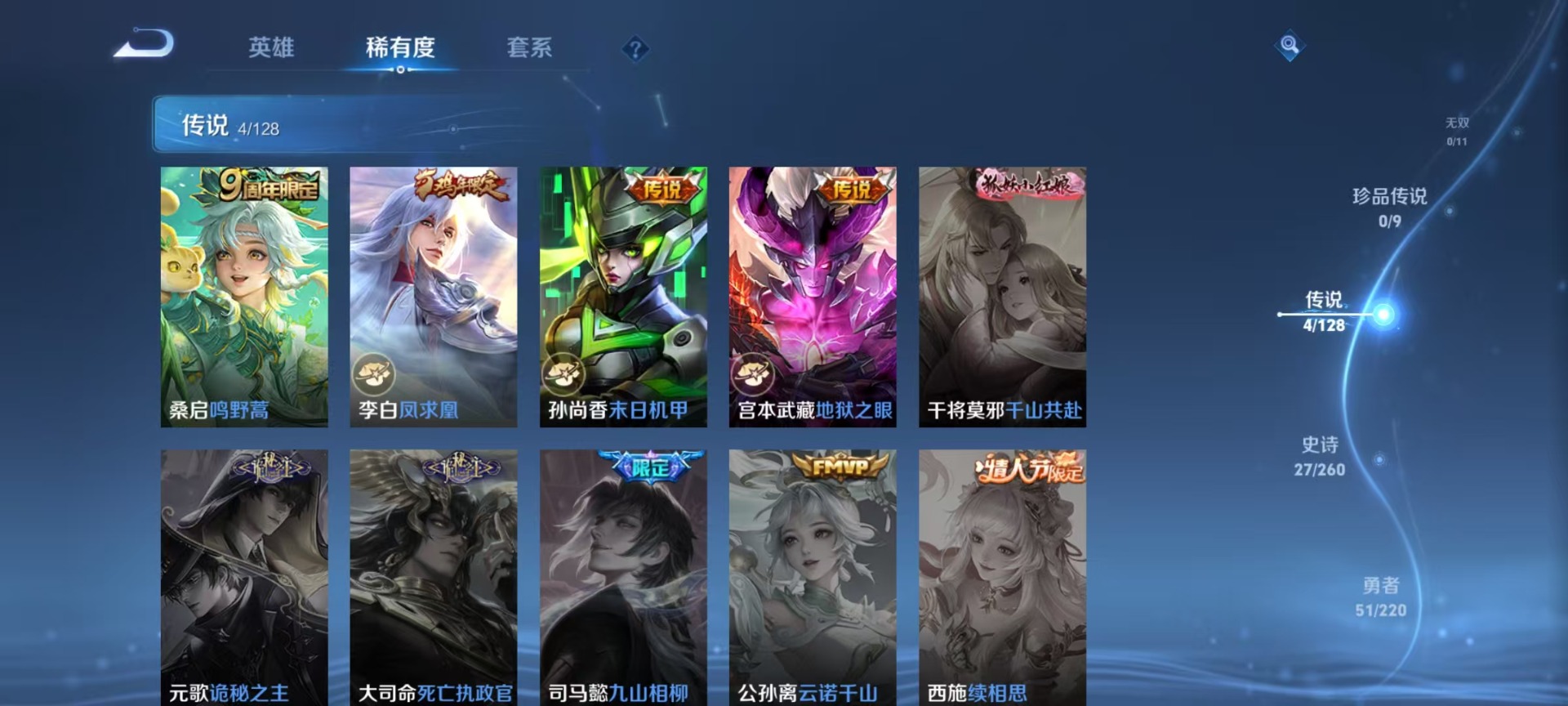 - PX_2080084-【152皮4传说愿照九州拓 云诺千山】:安卓Q-V6-至尊星耀II段位-123英雄-152皮肤-0典藏-0珍品无双-0无双-0珍品传说-4传说-48史诗 【内测皮肤】:孙尚香蔷薇恋人,狂铁特工战影 【传说皮肤】:桑启鸣野蒿,云缨幻光神枪,澜愿照九州拓,公孙离云诺千山 【限定皮肤】:蒙犽顽岩魄,大乔绒语心约,姜子牙天穹之誓,杨戬破阵退雄兵,狄仁杰阴阳师,赵云皇家上将,孙尚香蔷薇