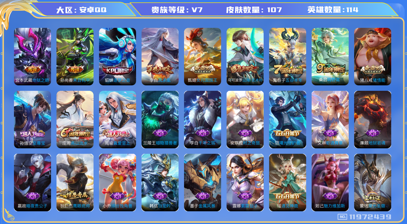 [11972439]V7 4传说 114英雄 107皮肤 可修改实名 优质装备:末日机甲-孙尚香(绿蚂蚱),地狱之眼 珍宝阁皮:优雅恋人 限定皮:鸣野蒿,至尊宝,凤求凰(白切鸡),高山流水,五谷丰年,逐梦之音,真爱至上,猪悟能,女儿国国王,山海·玄木吟(马可年限) 史诗皮:遇见神鹿,紫霞仙子,白龙吟,千年之狐,蒙恬荣光圣徽,时之奇旅-安琪拉,暗隐猎兽者,地狱岩魂,缤纷独角兽,曙光守护者,金属风暴,鹰眼统帅,暗夜贵公子,魅力维加斯,奇遇舞章