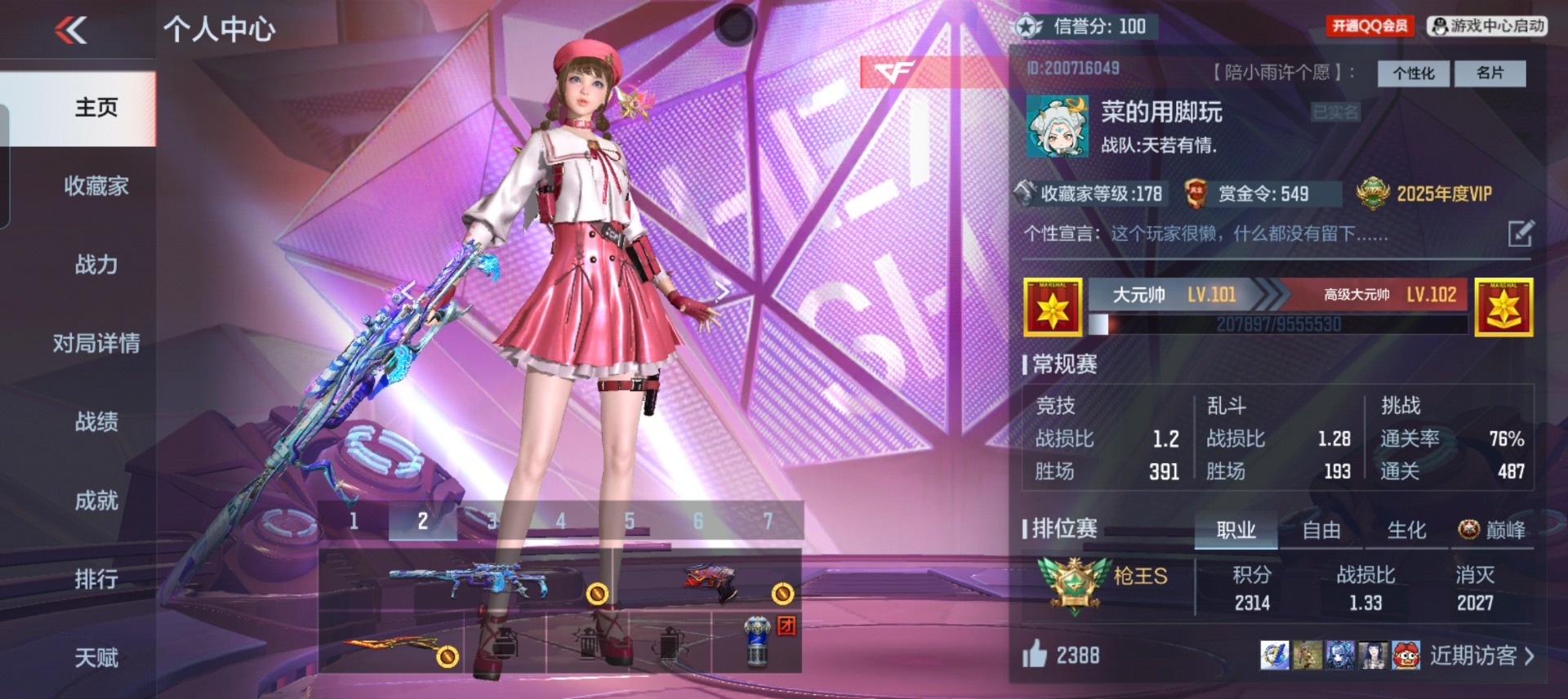 - PX_2100935-?/枪械3/装备94/战备69/王牌印记3/热力值28975/五级Kar98K-巳巳如意/四级AMR-智耀战神/五级Mk14-甜梦熊击/鸾凤武仙/角色-天鹅座 冰河/粉装-星穹咏叹调/套装-龟仙人/套装-巳巳如意/套装-紫幽梦/套装-蓝冰羽/Kar98K-巳巳如意/Mk14-甜梦熊击/AMR-智耀战神/AKM-灼热熔岩/AKM-王牌投手/AKM-破晓战魂/AKM-筑梦精灵/M