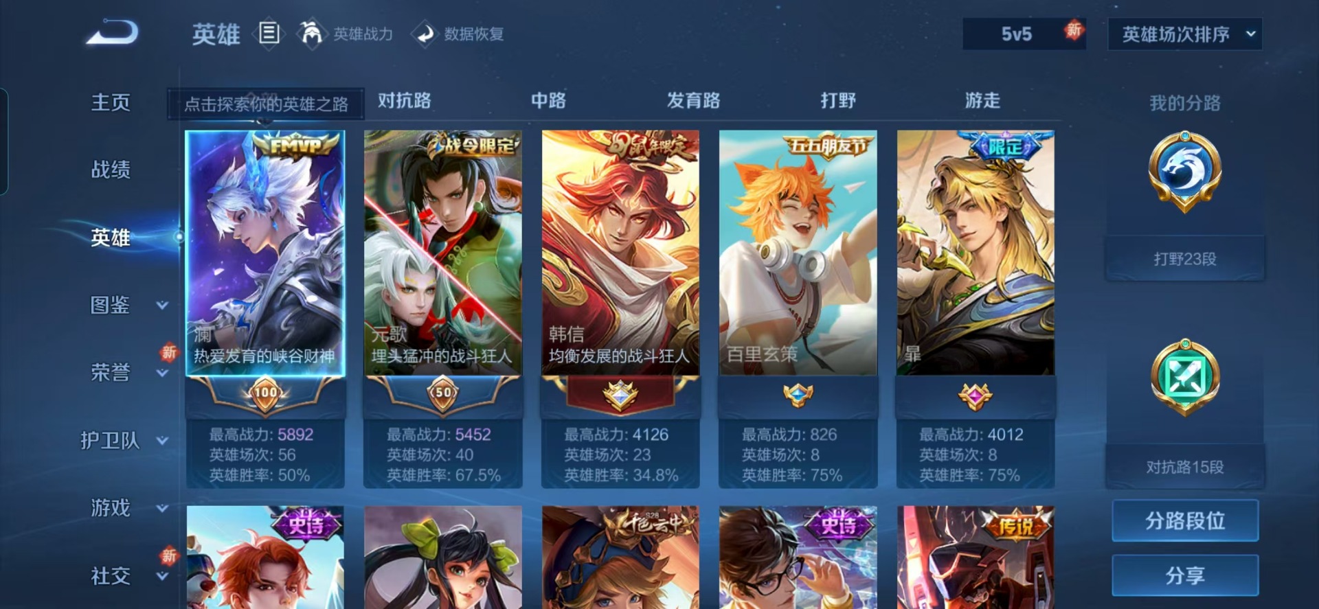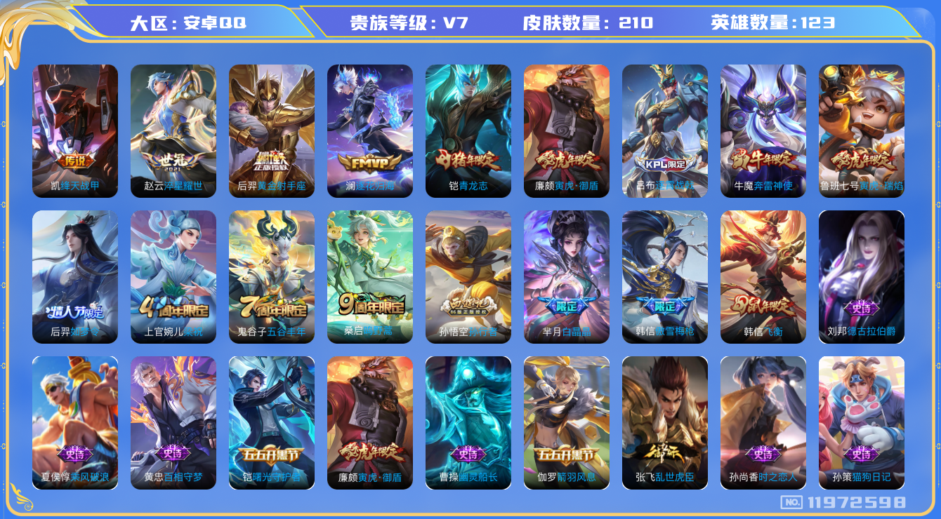 - [12085034]实名: 可修改 贵族等级: V10 英雄数: 125 皮肤数: 466 荣耀水晶: 鸣剑·曳影,全息碎影,九霄神辉 无双皮: 碎月剑心,韩信群星魔术团 珍品传说: 兔狲·蓬尾,酷洛米之心,大耳狗之梦,朽木白哉,黑崎一护 传说皮: 黄金狮子座,黄金射手座,绛天战甲,末日机甲-孙尚香,地狱火,仲夏夜之梦,零号·赤焰,时之恋人-刘备,淬星耀世,遇见胡旋,末日机甲-孙策,挚爱之约,挚爱花嫁,无双飞将,碎云,画中仙,妄想实况,艾琳觅芳踪,乘龙·问璇玑,落雪白狼,幻光神枪,祥瑞亨通,星之鸣奏,续相思,诡秘之主 限定皮: 冰锋战神,遇见飞天,李小龙,祈雪灵祝,游园惊梦,梁祝,时雨天司,引擎之心,魔法小厨娘,辉光之辰,异界灵契,天魔缭乱,神威,飞衡,天狼狩猎者,冰霜恋舞曲,逐梦之影,逐梦之光,神奇女侠,美猴王,白虎志,梅西,至尊宝,一生所爱,武陵仙君,如梦令-后羿,大圣娶亲,默契交锋-花木兰,霸王别姬-虞姬,高山流水,孙行者,猪悟能,寅虎·展翼,补天,百木心枪,玉兔公主,启示之音,匿光决锋者,无尽星芒,五谷丰年,神器·万象笔,山海·碧波行,齐天大圣,至美·化雀舞,至美·乘鲤谣,鸣野蒿,陌上桑,愿照·千秋盛,愿照·众生和,愿照·山河定,愿照·岁时盈,愿照·福禄聚,愿照·九州拓
