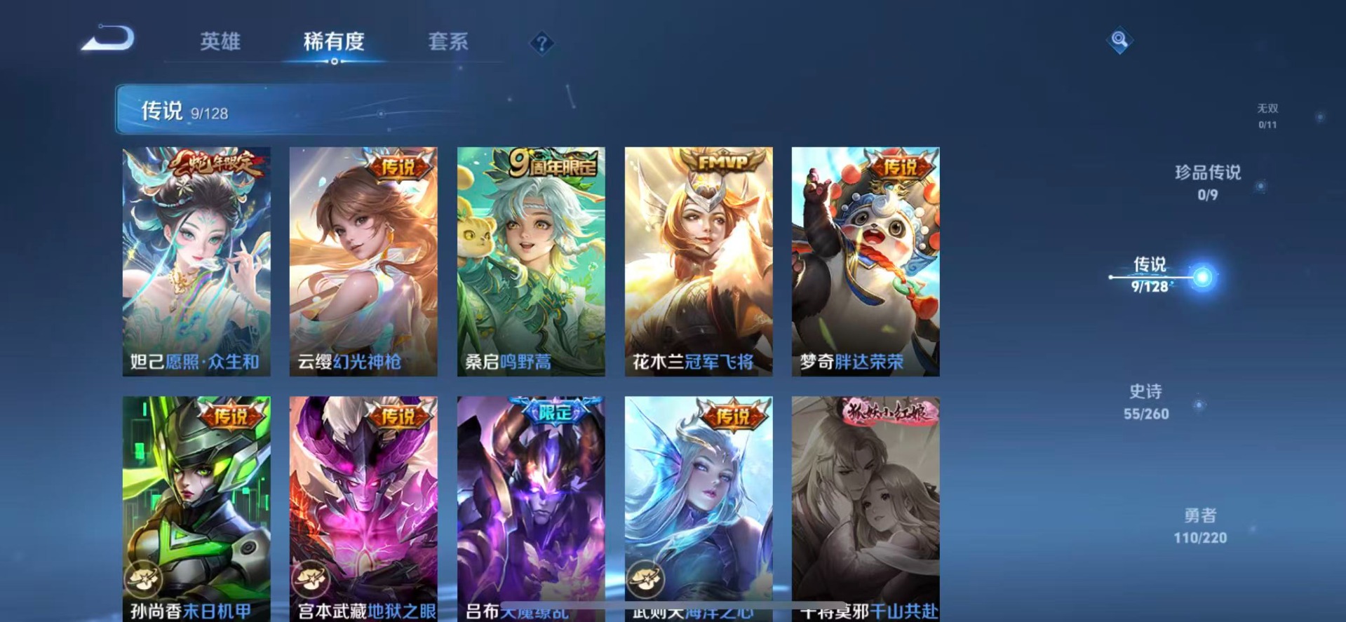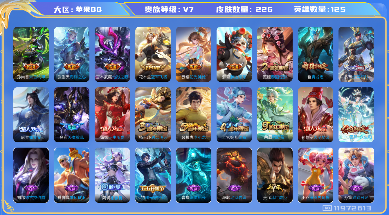 [11972613]V7 9传说 125英雄 226皮肤 典藏英雄武则天 可修改实名 优质装备:冠军飞将,末日机甲-孙尚香(绿蚂蚱),海洋之心,地狱之眼,胖达荣荣,涂山容容 传说皮:幻光神枪 珍宝阁皮:蔷薇恋人 限定皮:愿照·众生和(妲己年限),逐霄战戟,鸣野蒿,遇见飞天,青龙志(铠年限),游园惊梦,梁祝,李小龙,如梦令-后羿,一生所爱,大圣娶亲,天魔缭乱 史诗皮:化蝶舞,石田雨龙,织梦人,紫霞仙子,电玩小子(小书包),黄金分割率,特工魅影,千年之狐,魅语,冰冠公主,偶像歌手,末日机甲-吕布,猫狗日记-孙策,乱世虎臣,女仆咖啡,摇滚巨星,水果甜心,天才门将,星夜王子,德古拉伯爵,暗隐猎兽者,幽灵船长,鬼剑武藏,心灵战警,舞动绿茵,地狱岩魂,纤云弄巧,繁星吟游(呼啦呼啦),缤纷独角兽,乘风破浪,曙光守护者,金属风暴,原初追逐者,圣诞恋歌,鹰眼统帅,魅力维加斯,未来纪元-赵云