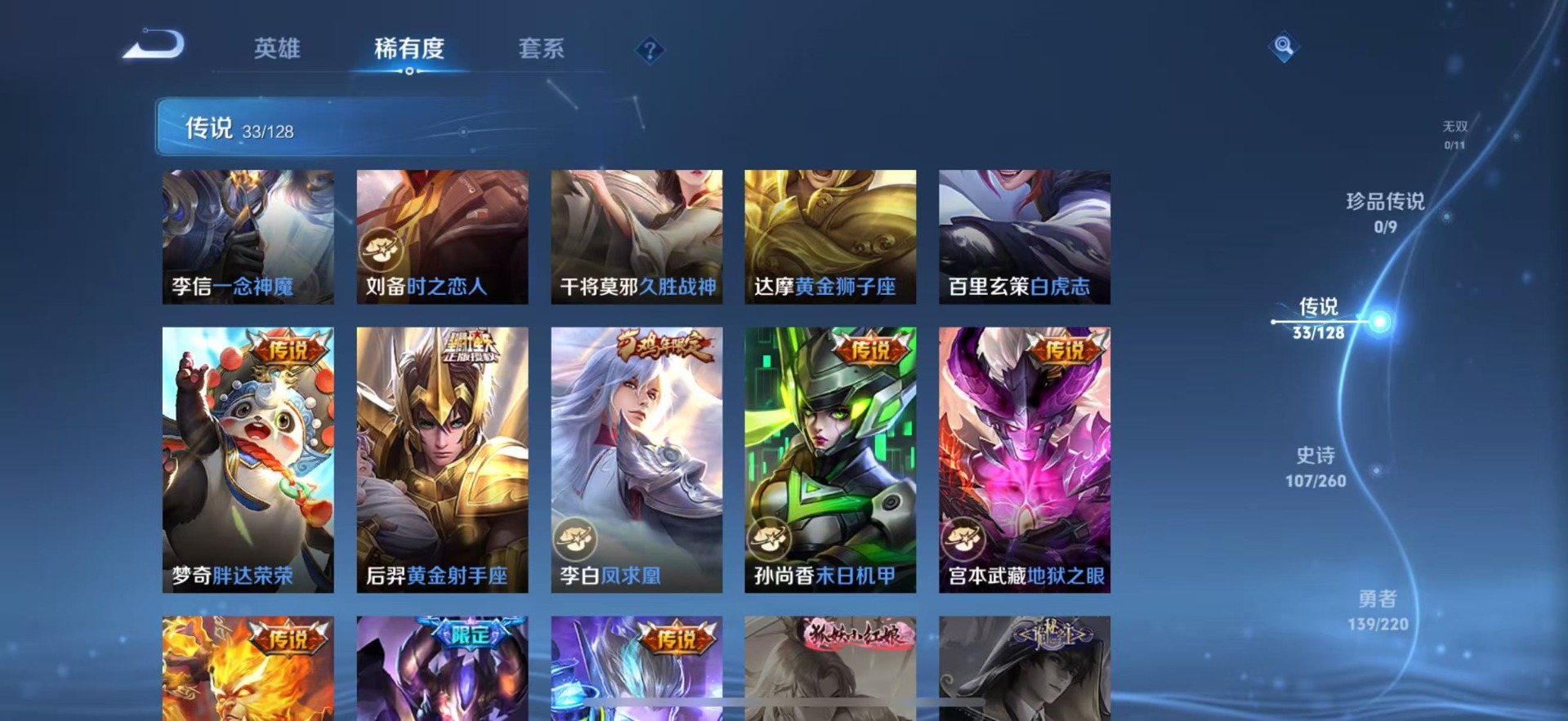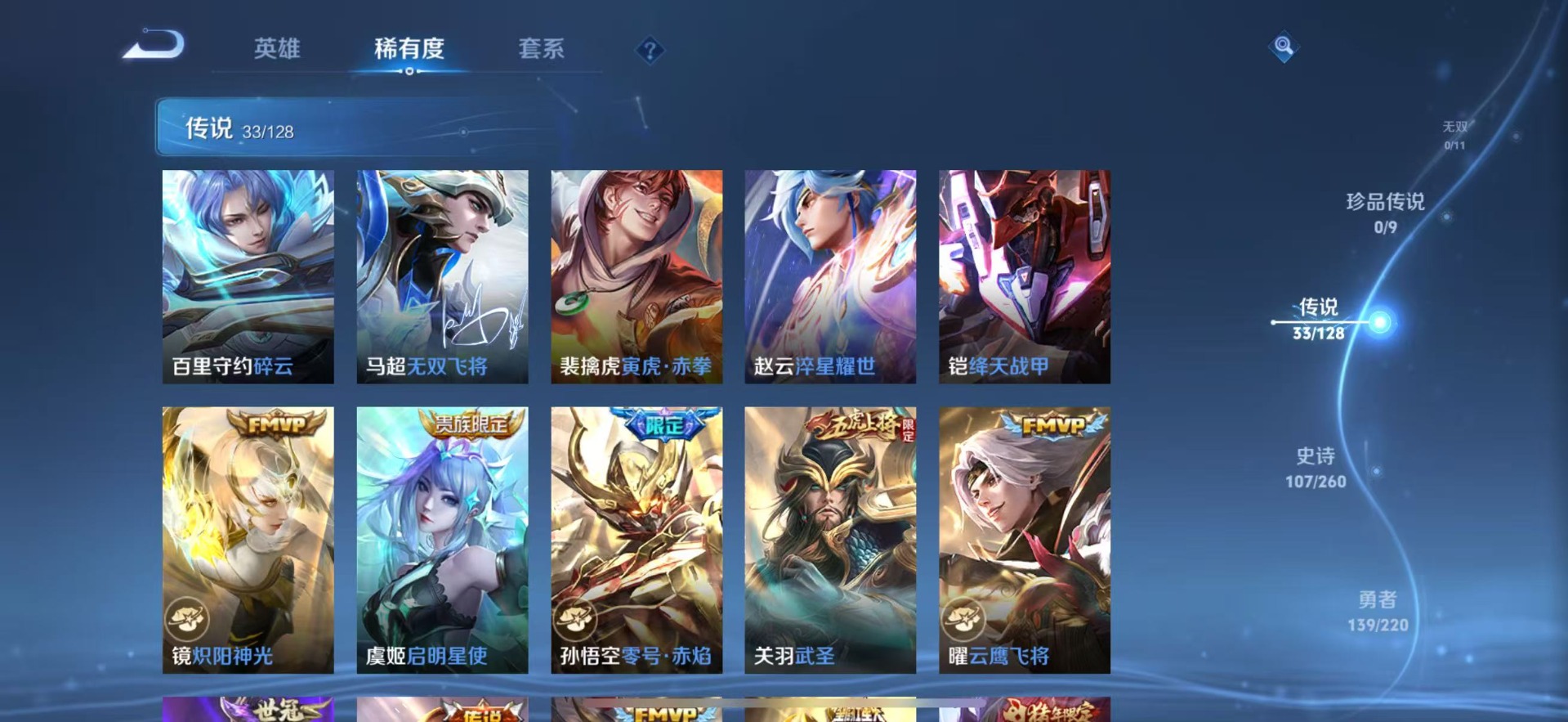 - [11609003]V6 3传说 123英雄 161皮肤 可修改实名 传说皮:幻光神枪 珍宝阁皮:蔷薇恋人 限定皮:愿照·九州拓(澜年限),愿照·岁时盈(虞姬年限),遇见飞天,游园惊梦,梁祝,李小龙,逐梦之影 史诗皮:化蝶舞,龙之律动,雪豹·霜爪,茶境仙,紫霞仙子,末日机甲-吕布,节奏热浪,水果甜心,暗隐猎兽者,诗语江南,纤云弄巧,繁星吟游(呼啦呼啦),缤纷独角兽,乘风破浪,逐浪之夏,曙光守护者,原初追逐者,鹰眼统帅,魅力维加斯