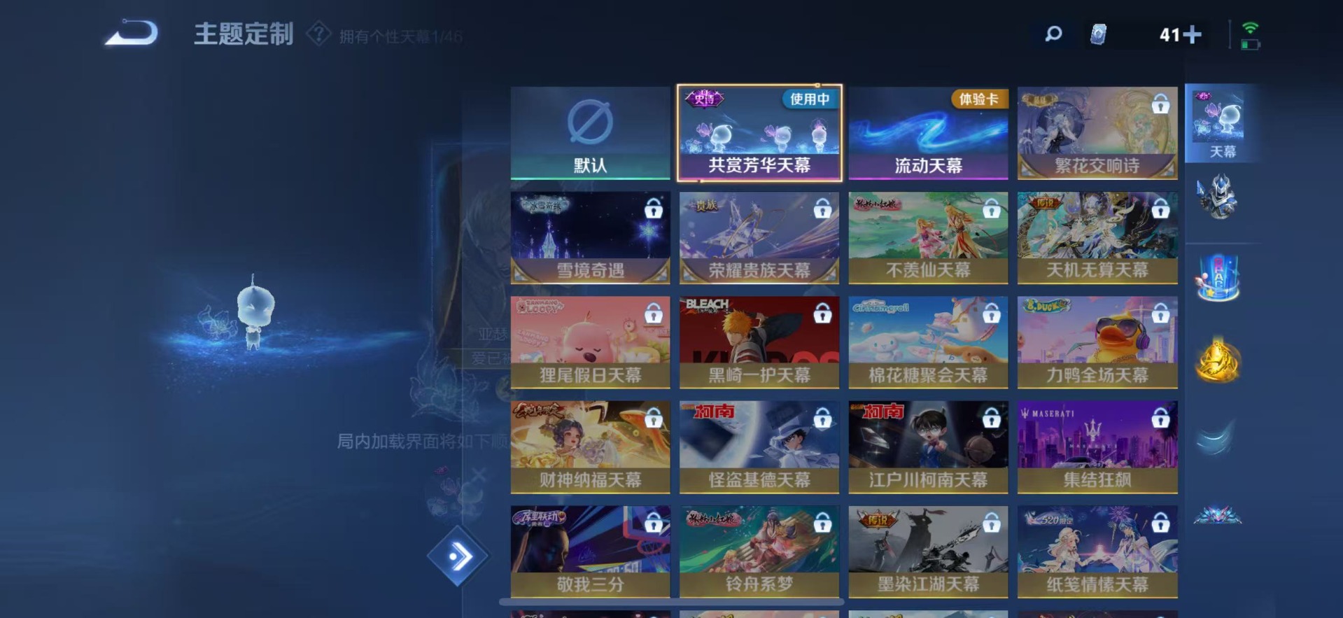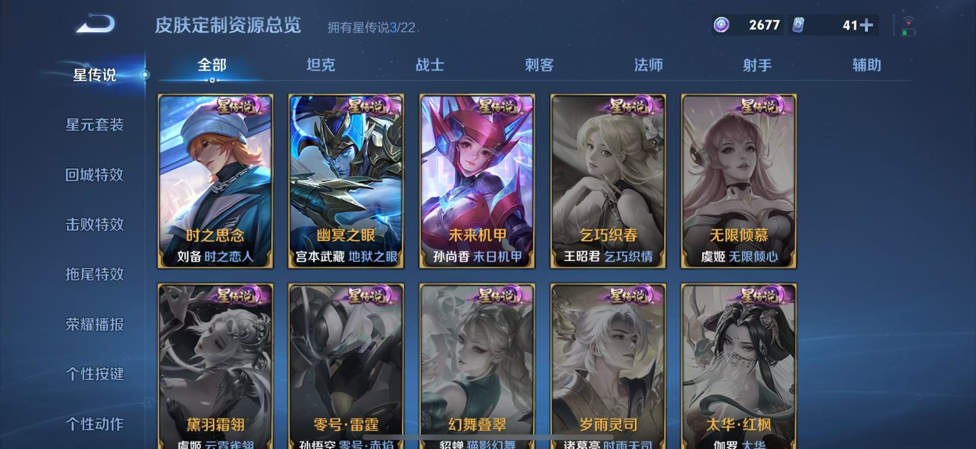 大乔猫狗日记,刘邦德古拉伯爵,夏侯惇乘风破浪,阿轲暗夜猫娘,阿轲节奏热浪,铠曙光守护者,曹操幽灵船长,伽罗箭羽风息,廉颇地狱岩魂,小乔缤纷独角兽,小乔青蛇,阿古朵顽趣,孙策猫狗日记,不知火舞魅语,鲁班七号电玩小子,项羽苍穹之光,吕布圣诞狂欢,吕布末日机甲,露娜紫霞仙子,诸葛亮黄金分割率,刘禅电玩·爆裂旋风,司马懿暗渊魔法,刘禅天才门将,宫本武藏鬼剑武藏,公孙离无限星赏官,兰陵王暗隐猎兽者,貂蝉圣诞恋歌,花木兰水晶猎龙者,夏洛特永昼,李白千年之狐,安琪拉心灵骇客,安琪拉时之奇旅,西施诗语江南,白起星夜王子,亚瑟心灵战警,嬴政摇滚巨星,嬴政暗夜贵公子,程咬金功夫厨神,百里玄策热力回旋,百里玄策原初追逐者,雅典娜黎明之约,韩信白龙吟,百里守约特工魅影,李元芳逐浪之夏,墨子龙骑士,蔡文姬舞动绿茵,澜赏金猎手,娜可露露晚萤,王昭君偶像歌手,嫦娥拒霜思,钟馗乐园奇幻夜,橘右京修罗