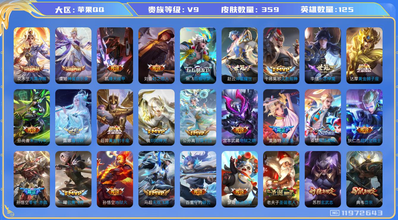 [11972643]V9 2典藏 33传说 125英雄 359皮肤 可修改实名 优质装备:九霄神辉(木兰典藏),神鉴启示录,黄金狮子座,黄金射手座,云鹰飞将(小将军),绛天战甲(鸡嘴战神),久胜战神,炽阳神光,一念神魔,末日机甲-孙尚香(绿蚂蚱),地狱火,零号·赤焰,地狱之眼,胖达荣荣,时之恋人-刘备(电焊工),淬星耀世,超时空战士-狄仁杰,无双飞将,碎云,浮生妄,百相守梦(张飞),追逃游戏(亚瑟),霜月吟 传说皮:云诺千山 珍宝阁皮:妄想食味,蔷薇恋人,玩趣恶龙 限定皮:愿照·九州拓(澜年限),愿照·岁时盈(虞姬年限),愿照·山河定(司空震年限),逐霄战戟,陌上桑,鸣野蒿,至尊宝,白虎志(电光耗子),凤求凰(白切鸡),时之彼端,神威(电光马子),遇见飞天,高山流水,诗剑行,冰锋战神,武圣,梁祝,天狼狩猎者,逐梦之星,岱宗(典韦年限),李小龙,逐梦之影,玄武志(苏烈年限),圣诞老人,孙行者,猪悟能,一生所爱,大圣娶亲,天魔缭乱,青春决赛季,云端筑梦师,寅虎·赤拳(老虎年限) 史诗皮:鸭鸭历险记-刘禅,化蝶舞,龙之律动,撼地雄心,破空之剑,战舞者,东方月初,紫霞仙子,苍穹之光,电玩小子(小书包),白龙吟,黄金分割率,特工魅影,千年之狐,永昼,魅语,蒙恬荣光圣徽,无限星赏官,青蛇,偶像歌手,晚萤,电玩·爆裂旋风,暗夜猫娘,龙骑士(小龙虾),末日机甲-吕布,猫狗日记-孙策,猫狗日记-大乔,节奏热浪,修罗,女仆咖啡,摇滚巨星,水果甜心,天才门将,星夜王子,心灵骇客,时之奇旅-安琪拉,功夫厨神,德古拉伯爵,暗隐猎兽者,幽灵船长,鬼剑武藏,暗渊魔法,心灵战警,乐园奇幻夜,舞动绿茵,地狱岩魂,诗语江南,纤云弄巧,繁星吟游(呼啦呼啦),拒霜思,缤纷独角兽,乘风破浪,逐浪之夏,月团寄思,水晶猎龙者,曙光守护者,热力回旋,箭羽风息,原初追逐者,圣诞狂欢,圣诞恋歌,鹰眼统帅,暗夜贵公子,黎明之约,赏金猎手,顽趣-阿古朵,无心,未来纪元-赵云