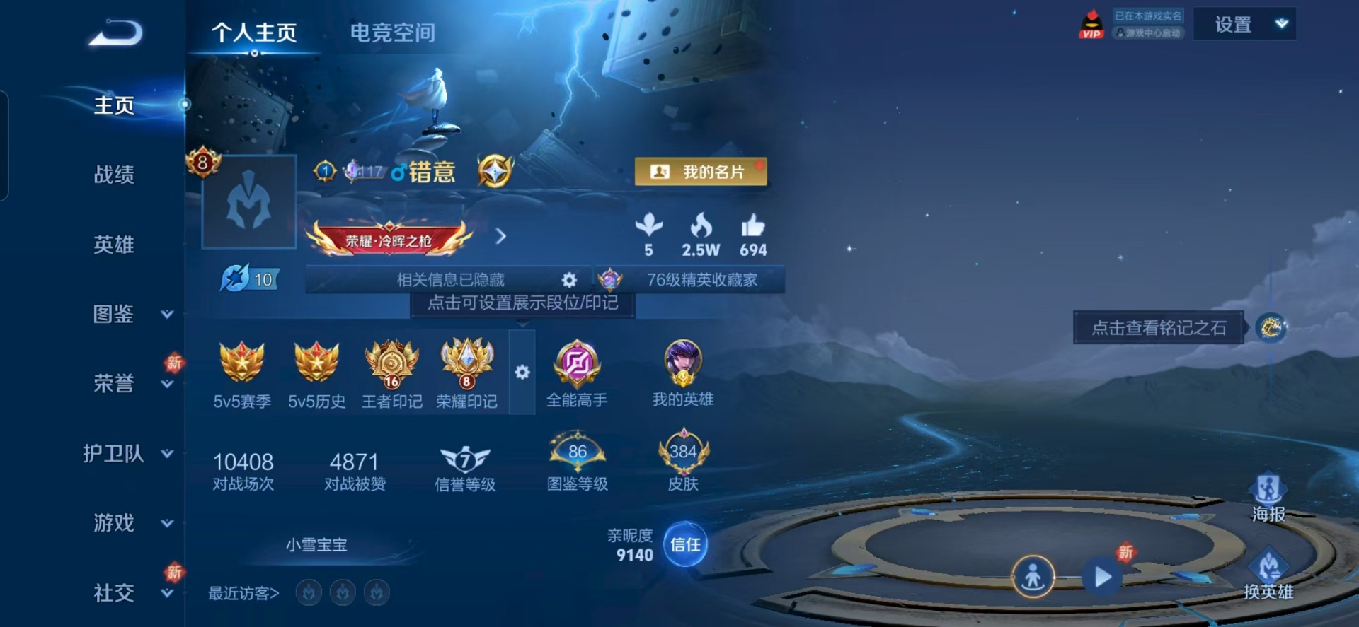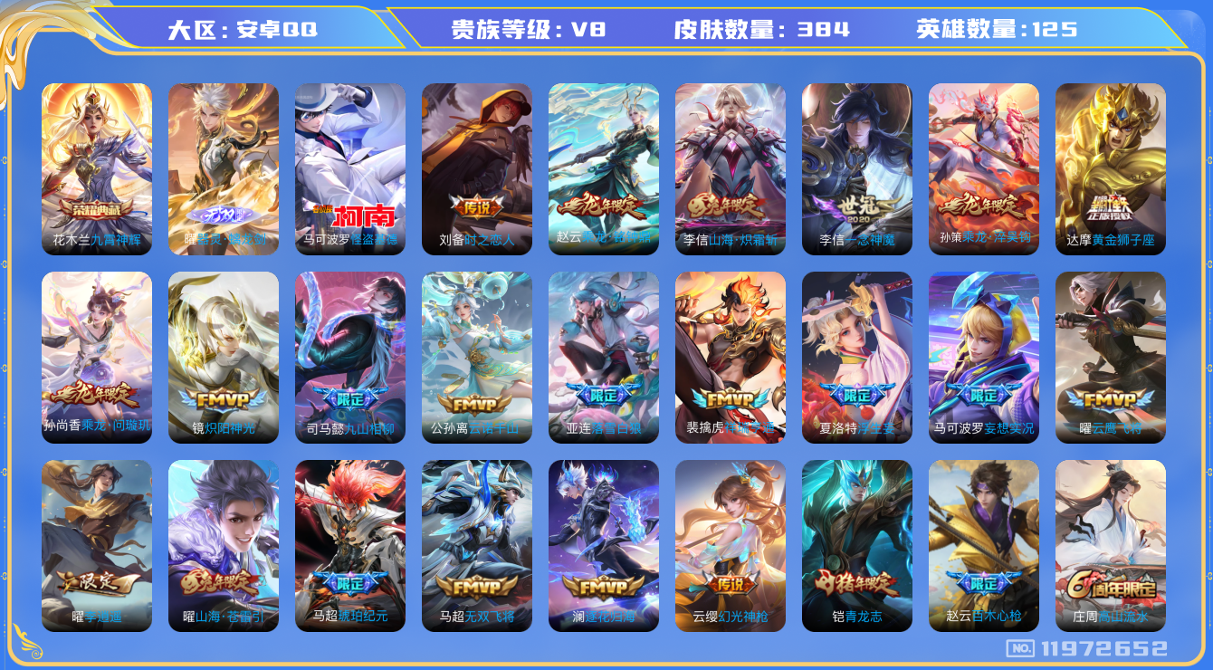 [11972652]V8 1典藏 1无双 1珍品传说 33传说 125英雄 384皮肤 可修改实名 优质装备:九霄神辉(木兰典藏),器灵·螭龙剑,怪盗基德,黄金狮子座,云鹰飞将(小将军),炽阳神光,一念神魔,李逍遥,时之恋人-刘备(电焊工),无双飞将,山海·炽霜斩(李信年限),山海·苍雷引(电光曜子),浮生妄,妄想实况,澜逐花归海,琥珀纪元马超 传说皮:乘龙·问璇玑(孙尚香年限),乘龙·铭钟鼎(赵云年限),乘龙·淬吴钩(孙策年限),落雪白狼,九山相柳,云诺千山,祥瑞亨通,幻光神枪 珍宝阁皮:妄想食味,女武神,玩趣恶龙 限定皮:愿照·九州拓(澜年限),愿照·山河定(司空震年限),鸣野蒿,武陵仙君(小桃花),傲雪梅枪,前尘镜,时雨天司(水龙头),神威(电光马子),飞衡(韩信年限),瑞麟志(木兰年限),高山流水,诗剑行,齐天大圣,五谷丰年,青龙志(铠年限),梁祝,李小龙,朱雀志(守约年限),孙行者,猪悟能,大圣娶亲,匿光追影者,寅虎·赤拳(老虎年限),百木心枪,深海之息(深海大菠萝),枫霜尽,山海·玄木吟(马可年限) 史诗皮:鸭鸭历险记-刘禅,器灵·浮梦炉,化蝶舞,灵蛊蚀心,星界战将,谪仙醉月,龙之律动,百相守梦-周瑜,茶境仙,破空之剑,琥珀纪元伽罗,超元猎域,百相守梦-黄忠,织梦人,紫霞仙子,黄金分割率,特工魅影,千年之狐,永昼,江河有灵,雪夜绮愿(周瑜),魅语,百解令(蒙犽),高渐离燃音魔法,蒙恬荣光圣徽,无限星赏官,冰冠公主,偶像歌手,白蛇,电玩·爆裂旋风,百相守梦(刘备),末日机甲-吕布,猫狗日记-孙策,猫狗日记-大乔,乱世虎臣,节奏热浪,修罗,女仆咖啡,摇滚巨星,水果甜心,绅士熊喵,星夜王子,心灵骇客,功夫厨神,德古拉伯爵,暗隐猎兽者,幽灵船长,鬼剑武藏,暗渊魔法,心灵战警,天秀·启明,舞动绿茵,地狱岩魂,纤云弄巧,拒霜思,缤纷独角兽,乘风破浪,逐浪之夏,水晶猎龙者,曙光守护者,箭羽风息,金属风暴,原初追逐者,圣诞狂欢,圣诞恋歌,鹰眼统帅,暗夜贵公子,黎明之约,赏金猎手,天秀·音浪,滕王阁序,无心,未来纪元-赵云