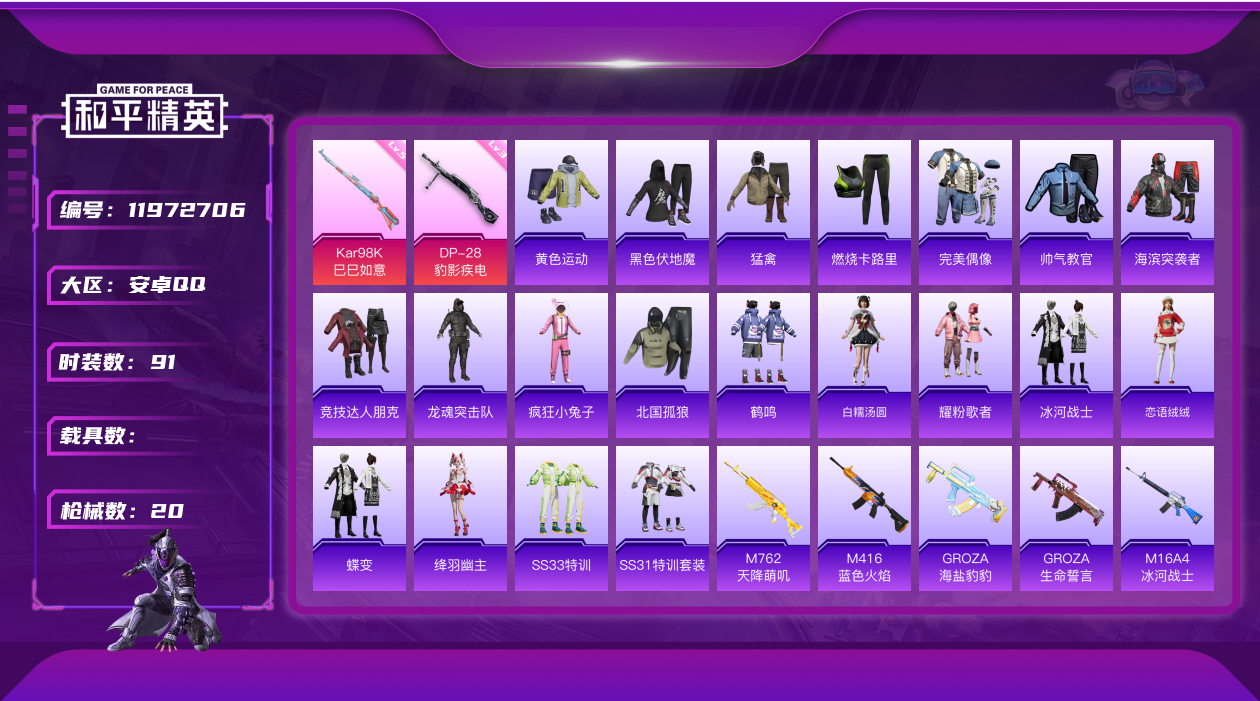 - PX_2085553- 苹果手Q-6王牌印记-6粉装-5特效枪-2载具-72913热力值-162套装-201枪皮-0卓越印记-0传奇印记 【6粉装】,未来领航者,古堡领主,飒粉甜心,智能音符,相思残雪,粉色回忆 【5特效枪】AKM-炫紫旋律-7级 M416-电玩时刻-5级 Kar98K-创世·救赎-5级 Kar98K-未来歌姬-4级 UMP45-相思残雪-7级 【4稀有紫装】,奇异狩猎者,雪山精
