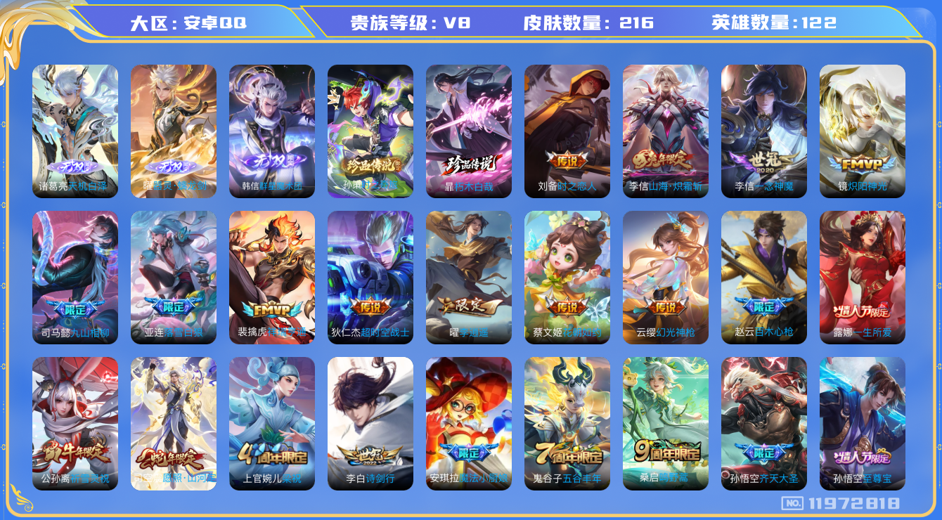 [11972818]V8 3无双 2珍品传说 18传说 122英雄 216皮肤 可修改实名 优质装备:韩信群星魔术团(韩信无双),器灵·螭龙剑,天机白泽,朽木白哉,炽阳神光,一念神魔,李逍遥,时之恋人-刘备(电焊工),超时空战士-狄仁杰,花朝如约(花篮子),山海·炽霜斩(李信年限) 珍品传说:时之奇旅-孙策 传说皮:落雪白狼,九山相柳,祥瑞亨通,幻光神枪 珍宝阁皮:妄想食味,万物之道 限定皮:愿照·九州拓(澜年限),愿照·山河定(司空震年限),鸣野蒿,至尊宝,魔法小厨娘,飞衡(韩信年限),诗剑行,齐天大圣,五谷丰年,梁祝,祈雪灵祝(雪兔子),一生所爱,百木心枪 史诗皮:鸭鸭历险记-刘禅,器灵·浮梦炉,星界战将,龙之律动,茶境仙,东方月初,蒙犽顽岩魄,百相守梦-黄忠,紫霞仙子,特工魅影,千年之狐,魅语,蒙恬荣光圣徽,冰冠公主,暗夜猫娘,末日机甲-吕布,时之恋人-孙尚香,节奏热浪,修罗,女仆咖啡,摇滚巨星,水果甜心,星夜王子,功夫厨神,德古拉伯爵,暗隐猎兽者,幽灵船长,鬼剑武藏,暗渊魔法,天秀·启明,舞动绿茵,地狱岩魂,缤纷独角兽,乘风破浪,逐浪之夏,水晶猎龙者,曙光守护者,原初追逐者,鹰眼统帅,魅力维加斯,黎明之约,赏金猎手,无心