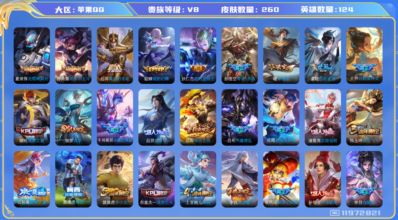 - [11657339]V9 4典藏 25传说 126英雄 366皮肤 典藏英雄武则天 可修改实名 优质装备:鸣剑·曳影,全息碎影(猴子典藏),九霄神辉(木兰典藏),弑枪猎影(韩信典藏),冠军飞将,云鹰飞将(小将军),久胜战神,一念神魔,地狱火,仲夏夜之梦(大飞蛾),海洋之心,音你心动-周瑜,淬星耀世,超时空战士-狄仁杰,音你闪耀(rap皮),碎云,山海·炽霜斩(李信年限),山海·苍雷引(电光曜子),画中仙,鹤归松栖(云缨) 珍宝阁皮:优雅恋人,蔷薇恋人,女武神 限定皮:鸣野蒿,至尊宝,凤求凰(白切鸡),太华(伽罗年限),武陵仙君(小桃花),时雨天司(水龙头),高山流水,诗剑行,怒海麟威,五谷丰年,青龙志(铠年限),梁祝,天狼溯光者,李小龙,朱雀志(守约年限),如梦令-后羿,孙行者,猪悟能,大圣娶亲,寅虎·御盾(廉颇年限),深海之息(深海大菠萝),冰霜神祇 史诗皮:鸭鸭历险记-刘禅,化蝶舞,灵蛊蚀心,星界战将,怒海争锋,百相守梦-黄忠,遇见神鹿,紫霞仙子,苍穹之光,电玩小子(小书包),白龙吟,黄金分割率,特工魅影,千年之狐,永昼,江河有灵,闲日渔趣,魅语,百解令(蒙犽),蒙恬荣光圣徽,冰冠公主,青蛇,偶像歌手,电玩·爆裂旋风,暗夜猫娘,龙骑士(小龙虾),末日机甲-吕布,猫狗日记-孙策,猫狗日记-大乔,时之恋人-孙尚香,乱世虎臣,节奏热浪,修罗,女仆咖啡,摇滚巨星,水果甜心,绅士熊喵,天才门将,星夜王子,心灵骇客,功夫厨神,德古拉伯爵,暗隐猎兽者,幽灵船长,鬼剑武藏,暗渊魔法,心灵战警,乐园奇幻夜,舞动绿茵,地狱岩魂,纤云弄巧,繁星吟游(呼啦呼啦),拒霜思,缤纷独角兽,乘风破浪,逐浪之夏,水晶猎龙者,曙光守护者,热力回旋,箭羽风息,金属风暴,原初追逐者,圣诞狂欢,圣诞恋歌,鹰眼统帅,暗夜贵公子,魅力维加斯,黎明之约,赏金猎手,寅虎·御盾,无心,未来纪元-赵云