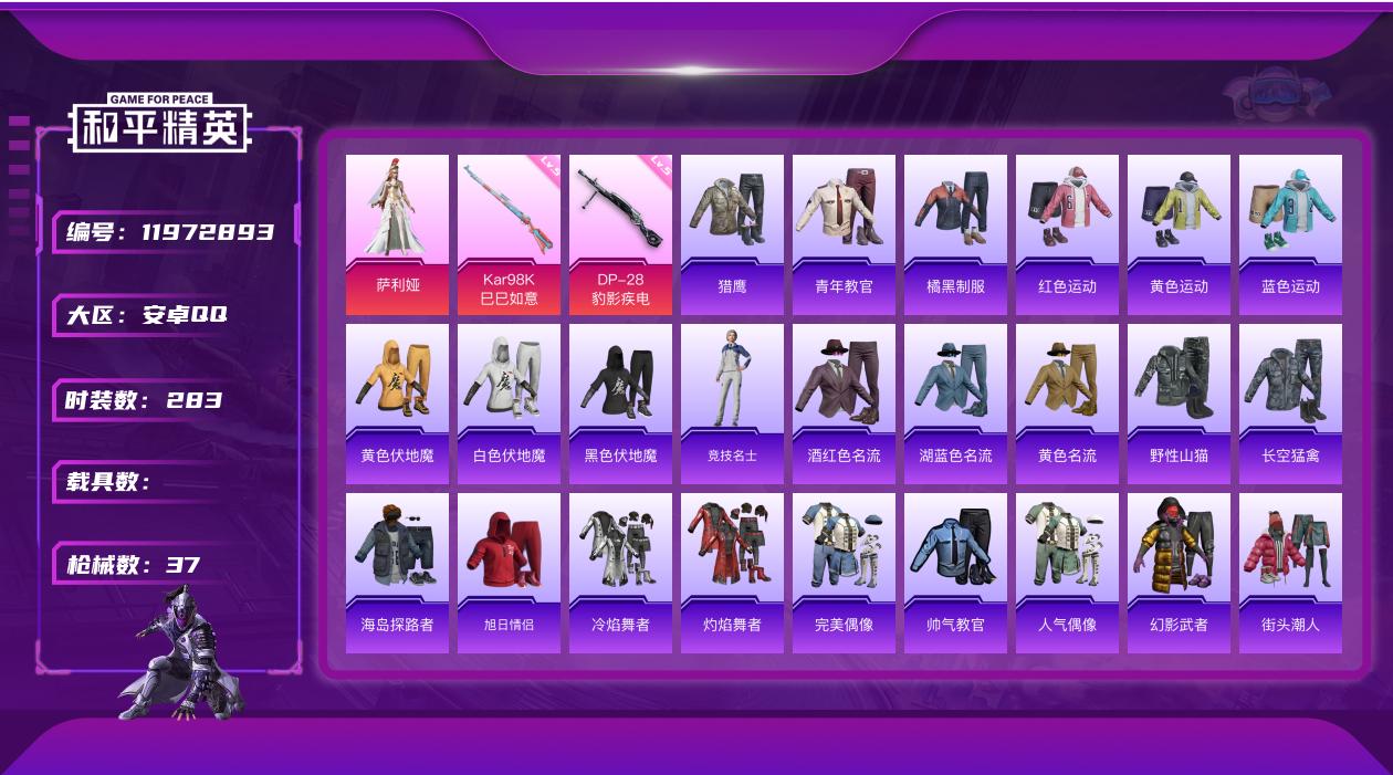 [11972893]1粉装 2特效枪 可二次 可修改实名 优质装备:萨利娅,Kar98K-巳巳如意 稀有枪皮:DP-28-豹影疾电 五级特效枪:五级Kar98K-巳巳如意,五级DP-28-豹影疾电 紫色装扮:SS31特训套装,SS33特训套装,青涩时光,旭日情侣,SS21特训,顶瓜瓜,冷焰舞者,完美偶像,帅气教官,幻影武者,人气偶像,SS18特训,黄色名流,青年教官,魅力单车,黄色伏地魔,黄色运动,黑色伏地魔,龙的传人,冰河战士,龙魂突击队,香桃花海,霓虹街区,都市魅力,酒红色名流,野性山猫,长空猛禽,街头潮人,深蓝色名流,湖蓝色名流,灼焰舞者,海岛探路者,极速红龙,橘黑制服,竞技达人朋克,红色运动,缤纷果语,蓝彩潮人,蓝色运动,空投萌叽,生化防暴队,猎鹰,空岛之星,白色伏地魔,破晓战魂,破蛋小黄鸡,星途旅人,巳巳如意,烈火街头,森林游猎者,风玲,憨乐熊二,智谋强哥,竞技名士,街头风暴,SS25特训,SS26特训,耀粉歌者,大橘大利,星渊小夜曲,SS32特训服(SS32特训套装),绯格组合,恋语绒绒 优质战备:冷漠罗丽降落伞