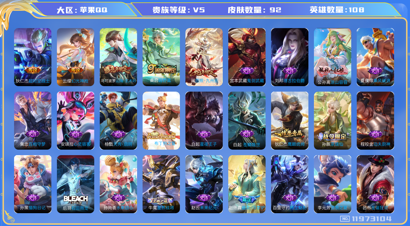 [11973104]V5 4传说 108英雄 92皮肤 可修改实名 优质装备:超时空战士-狄仁杰,涂山容容 传说皮:幻光神枪 珍宝阁皮:优雅恋人 限定皮:愿照·九州拓(澜年限),鸣野蒿,山海·玄木吟(马可年限) 史诗皮:鸭鸭历险记-刘禅,苍鳞隐世,器灵·浮梦炉,星界战将,龙之律动,布丁狗之誓,石田雨龙,茶境仙,百相守梦-黄忠,特工魅影,蒙恬荣光圣徽,偶像歌手,末日机甲-吕布,猫狗日记-孙策,水果甜心,星夜王子,心灵骇客,功夫厨神,德古拉伯爵,鬼剑武藏,暗渊魔法,乐园奇幻夜,天秀·启明,乘风破浪,逐浪之夏,圣诞狂欢,鹰眼统帅,魅力维加斯,未来纪元-赵云