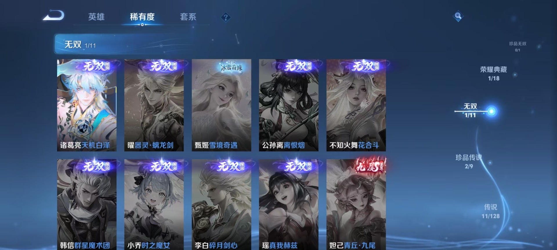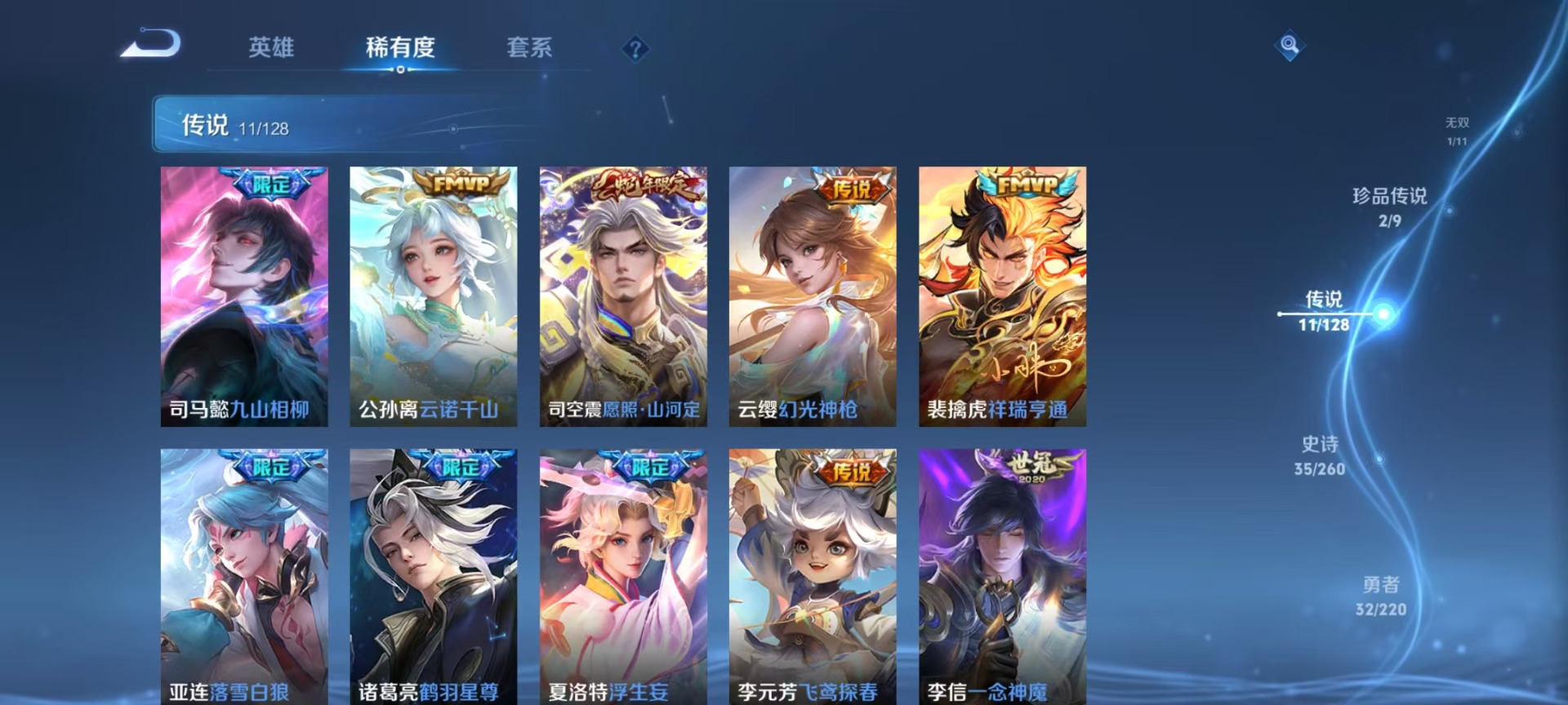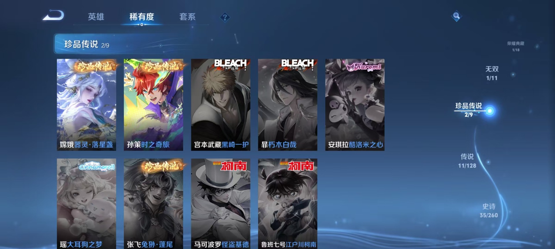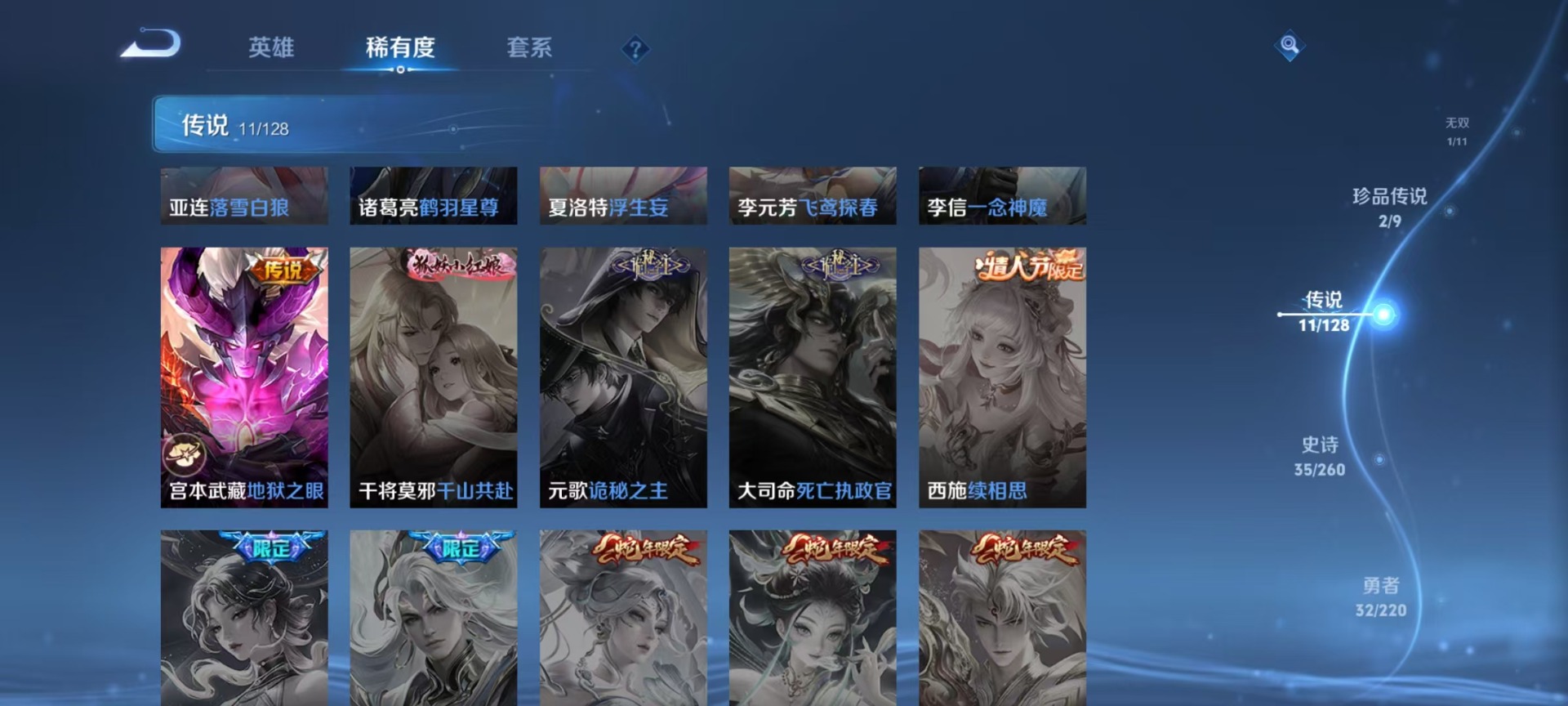 - PX_2079608-48 安卓QQ/至尊星耀/162皮肤/124英雄/2典藏/0珍品无双/0无双/2珍品传说/16传说/39史诗/8稀有英雄 【2 珍品传说】怪盗基德 马可波罗,时之奇旅 孙策, 【2 典藏皮肤】银白咏叹调 铠,弑枪猎影 韩信, 【16 传说皮肤】武圣 关羽,电玩·雷克斯 澜,无双飞将 马超,齐天大圣 孙悟空,地狱之眼 宫本武藏,炽阳神光 镜,遇见神鼓 吕布,霜月吟 露娜,时之恋