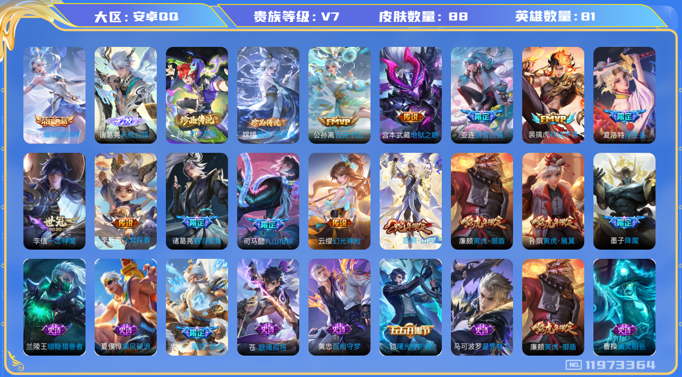 [11973364]V7 1典藏 1无双 2珍品传说 11传说 81英雄 88皮肤 可修改实名 优质装备:最初的交响(伽罗典藏),天机白泽,器灵·落星盏,一念神魔,地狱之眼,飞鸢探春,浮生妄,鹤羽星尊 珍品传说:时之奇旅-孙策 传说皮:落雪白狼,九山相柳,云诺千山,祥瑞亨通,幻光神枪 限定皮:愿照·山河定(司空震年限),寅虎·展翼(孙膑年限),降魔,寅虎·御盾(廉颇年限) 史诗皮:赞萌露比,鸭鸭历险记-刘禅,苍鳞隐世,器灵·浮梦炉,狼魂孤将,龙之律动,雪豹·霜爪,藏狐·褐绒,石田雨龙,百相守梦-周瑜,茶境仙,星界特工,百相守梦-黄忠,黄金分割率,魅语,偶像歌手,龙骑士(小龙虾),末日机甲-吕布,猫狗日记-孙策,水果甜心,星夜王子,暗隐猎兽者,幽灵船长,乐园奇幻夜,舞动绿茵,乘风破浪,曙光守护者,箭羽风息,鹰眼统帅,魅力维加斯,寅虎·御盾
