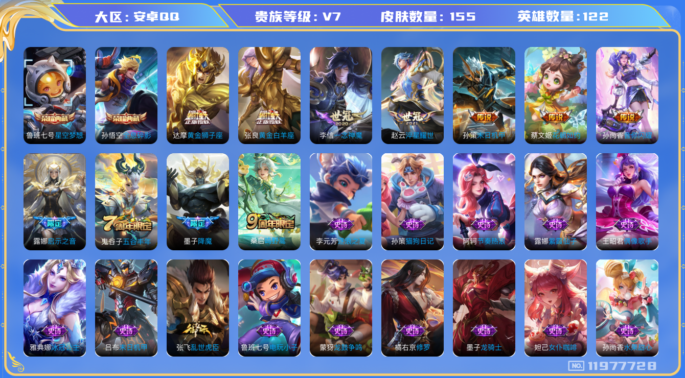 - [11601983]V8 2典藏 1无双 14传说 125英雄 227皮肤 可修改实名 孙悟空大国标 优质装备:全息碎影(猴子典藏),银白咏叹调(倪克斯侍卫),碎月剑心(李白无双),黄金射手座,猫影幻舞,炽阳神光,地狱火,胖达荣荣,乞巧织情,淬星耀世,无双飞将 珍宝阁皮:优雅恋人 限定皮:至尊宝,白虎志(电光耗子),神威(电光马子),齐天大圣,怒海麟威,五谷丰年,梁祝,天狼征服者,天狼绘梦者,李小龙,辉光之辰,猪悟能,大圣娶亲,寅虎·赤拳(老虎年限),枫霜尽 史诗皮:星界战将,东方月初,紫霞仙子,电玩小子(小书包),白龙吟,黄金分割率,特工魅影,千年之狐,蒙恬荣光圣徽,偶像歌手,龙骑士(小龙虾),暗夜猫娘,魅语,冰冠公主,末日机甲-吕布,猫狗日记-孙策,节奏热浪,摇滚巨星,水果甜心,绅士熊喵,星夜王子,功夫厨神,暗隐猎兽者,幽灵船长,鬼剑武藏,心灵战警,舞动绿茵,纤云弄巧,繁星吟游(呼啦呼啦),乘风破浪,曙光守护者,金属风暴,原初追逐者,圣诞狂欢,圣诞恋歌,鹰眼统帅,赏金猎手,未来纪元-赵云