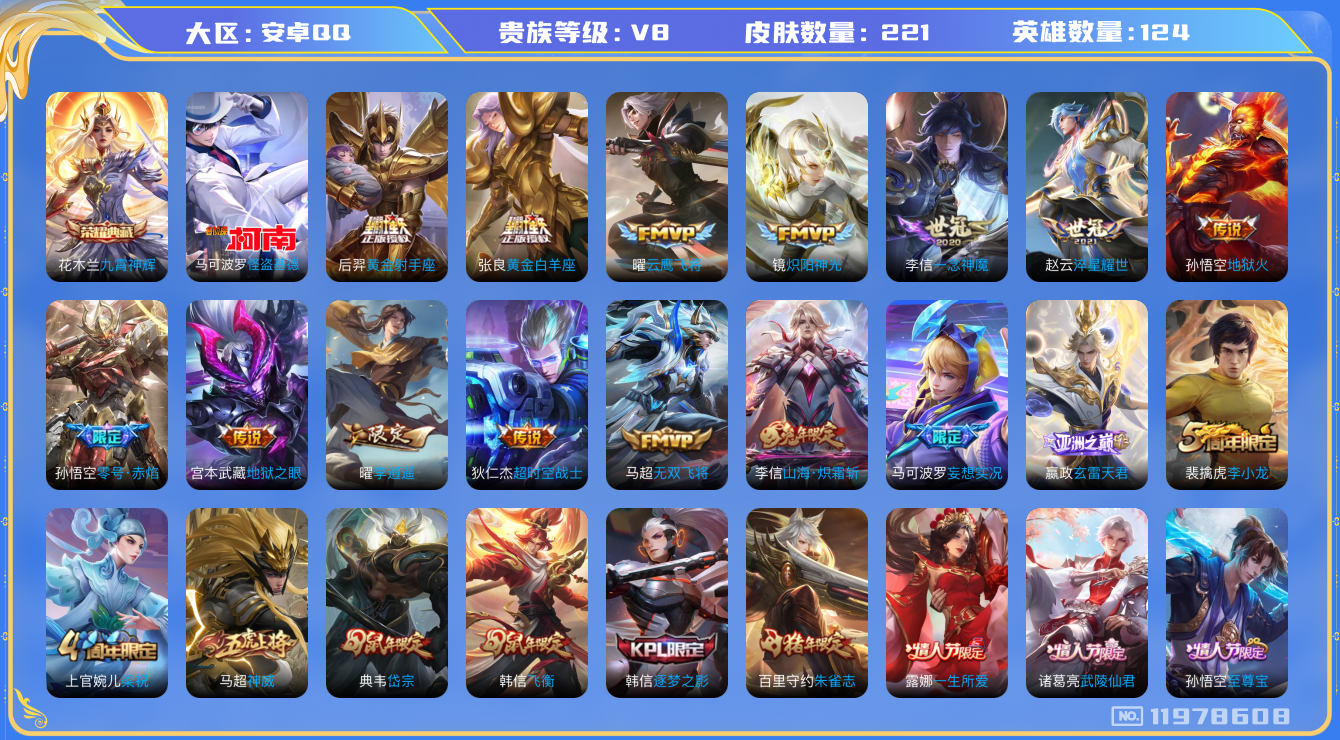 [11978608]【商品标题】:安卓Q-V8-尊贵铂金IV段位-124英雄-221皮肤-1典藏-0珍品无双-0无双-1珍品传说-21传说-68史诗