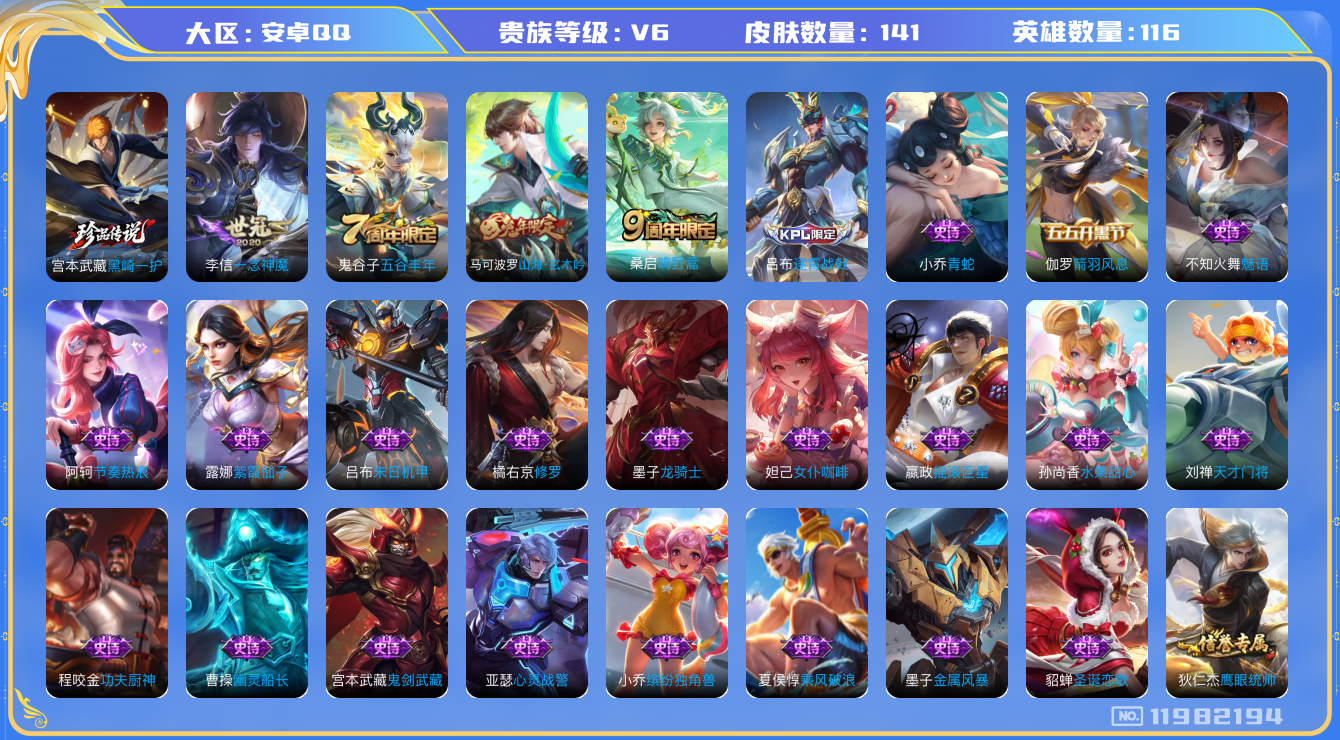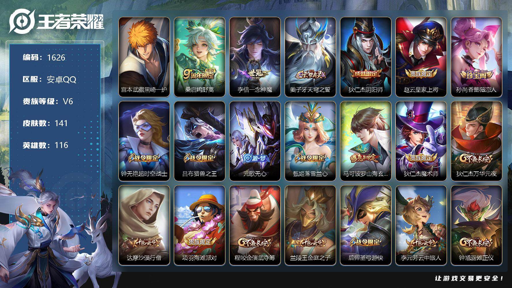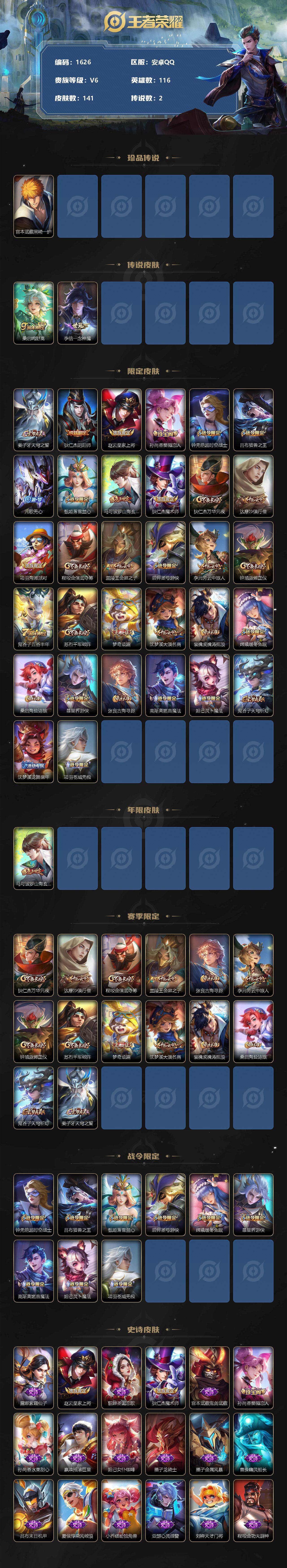[11982194]【商品标题】:安卓Q-V6-最强王者段位-116英雄-141皮肤-0典藏-0珍品无双-0无双-1珍品传说-2传说-36史诗
