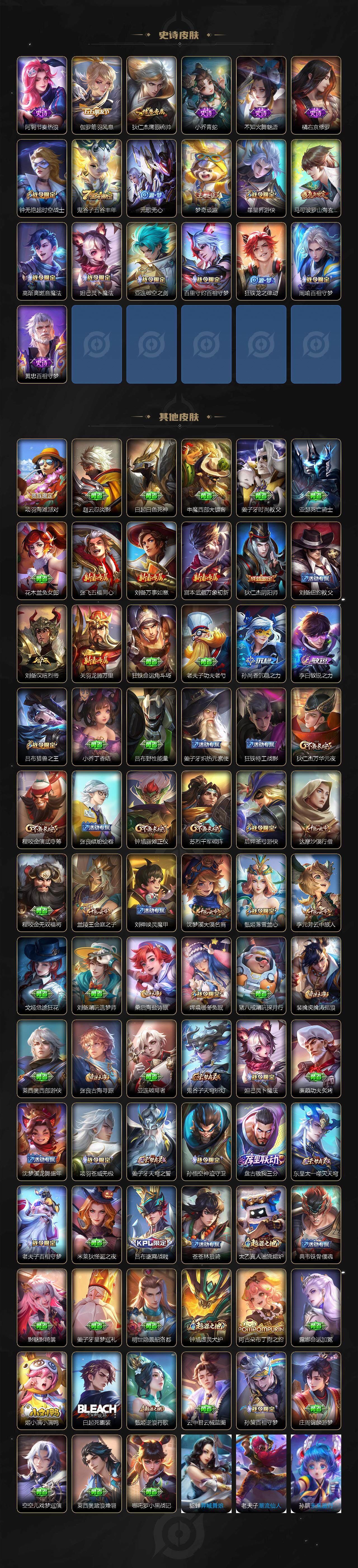【史诗皮肤】:露娜紫霞仙子,赵云皇家上将,貂蝉圣诞恋歌,狄仁杰魔术师,宫本武藏鬼剑武藏,孙尚香蔷薇恋人,孙尚香水果甜心,嬴政摇滚巨星,妲己女仆咖啡,墨子龙骑士,墨子金属风暴,曹操幽灵船长,吕布末日机甲,夏侯惇乘风破浪,小乔缤纷独角兽,亚瑟心灵战警,刘禅天才门将,程咬金功夫厨神,阿轲节奏热浪,伽罗箭羽风息,狄仁杰鹰眼统帅,小乔青蛇,不知火舞魅语,橘右京修罗,钟无艳超时空战士,鬼谷子五谷丰年,元歌无心,梦奇顽趣,暃星界游侠,马可波罗山海玄木吟,妲己灵卜魔法,高渐离燃音魔法,亚连破空之剑,百里守约百相守梦,狂铁龙之律动,周瑜百相守梦,黄忠百相守梦