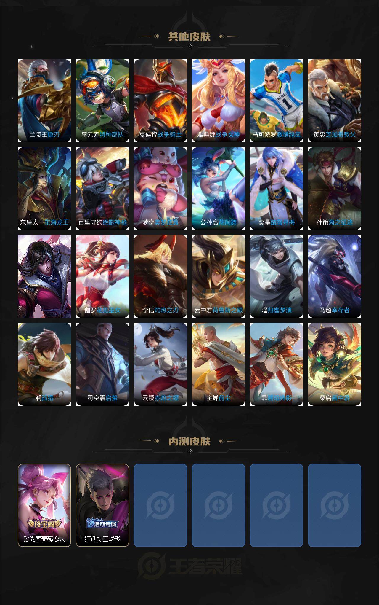 【其他皮肤】:项羽海滩派对,赵云忍炎影,白起白色死神,牛魔西部大镖客,姜子牙时尚教父,亚瑟死亡骑士,花木兰兔女郎,张飞五福同心,刘备万事如意,宫本武藏万象初新,狄仁杰阴阳师,刘备纽约教父,刘备汉昭烈帝,关羽龙腾万里,狂铁命运角斗场,老夫子功夫老勺,孙尚香沉稳之力,李白敏锐之力,吕布猎兽之王,小乔丁香结,吕布野性能量,姜子牙炽热元素使,狂铁特工战影,狄仁杰万华元夜,程