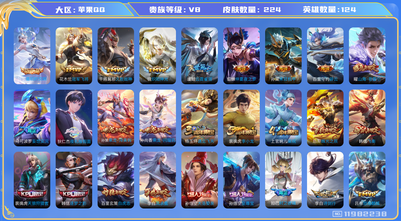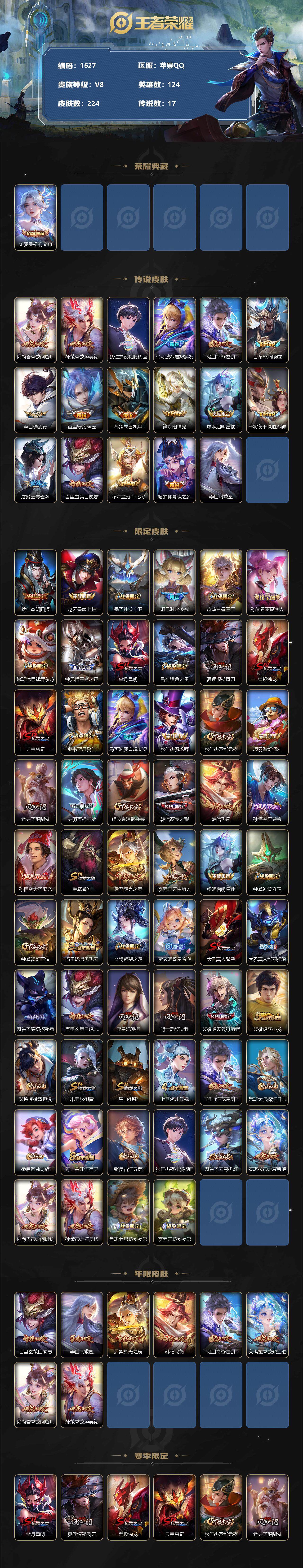 [11982238]【商品标题】:苹果Q-V8-最强王者段位-124英雄-224皮肤-1典藏-0珍品无双-0无双-0珍品传说-17传说-49史诗