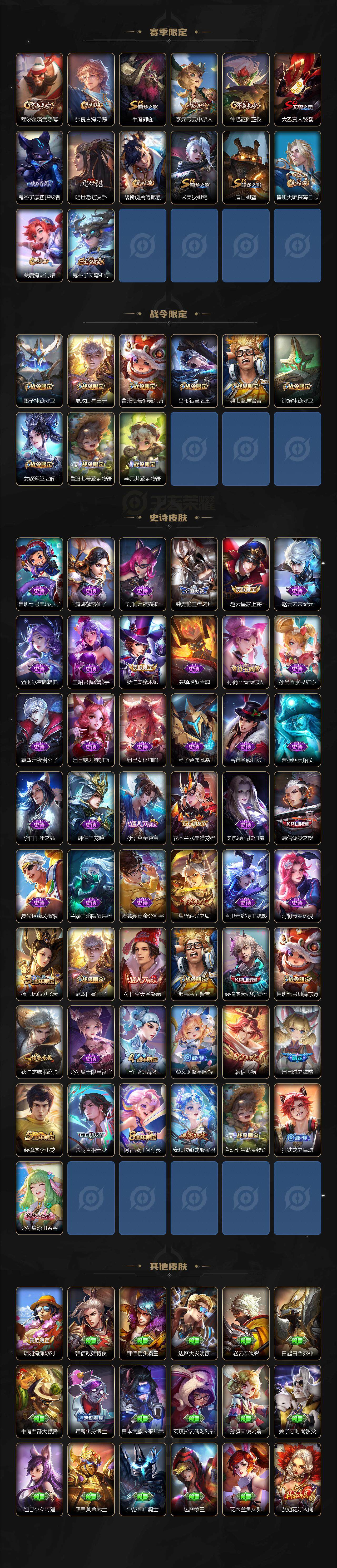- PX_1917435-贵族7/皮肤202/传说13/史诗48/英雄123/玩趣恶龙/特工战影/时之恋人男/一念神魔/炽阳神光/乞巧织情/淬星耀世/无双飞将/山海苍雷引/浮生妄/记忆之芯/霜月吟/桑启鸣野蒿/裴擒虎祥瑞亨通/云缨幻光神枪/蔡文姬夏日便利店/大乔绒语心约/虞姬夏日便利店/姜子牙天穹之誓/狄仁杰阴阳师/赵云皇家上将/玩趣恶龙/元歌无心/山海玄木吟/狄仁杰魔术师/沙漠行僧/项羽海滩派对/飞