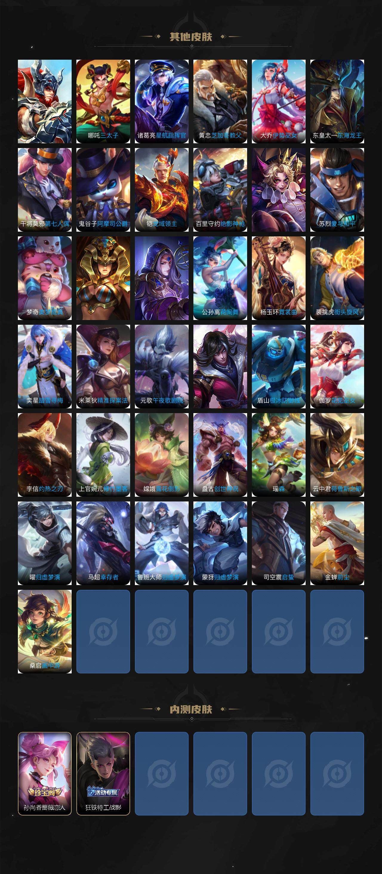 【赛季限定】:芈月重明,夏侯惇朔风刀,曹操烛龙,典韦穷奇,狄仁杰万华元夜,老夫子醍醐杖,程咬金演武夺筹,张良古海寻踪,牛魔御旌,李元芳云中旅人,钟馗驱傩正仪,太乙真人饕餮,鬼谷子原初探秘者,弈星混沌棋,明世隐疑决卦,裴擒虎擒涛扼浪,米莱狄御霄,盾山御銮,鲁班大师探海日志,桑启海盐诗旅,鬼谷子天穹祈灯