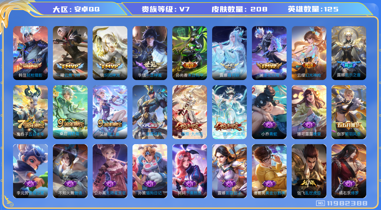 [11982388]【商品标题】:安卓Q-V7-最强王者段位-125英雄-208皮肤-1典藏-0珍品无双-0无双-0珍品传说-11传说-54史诗