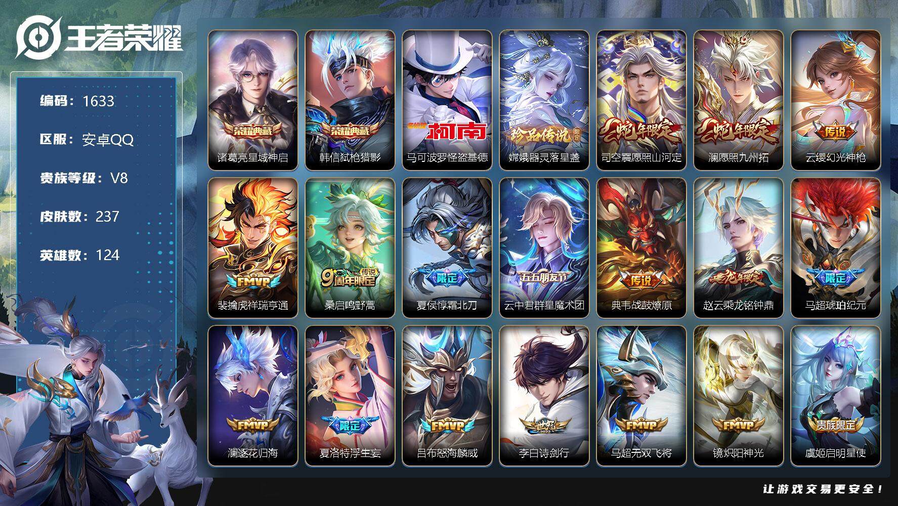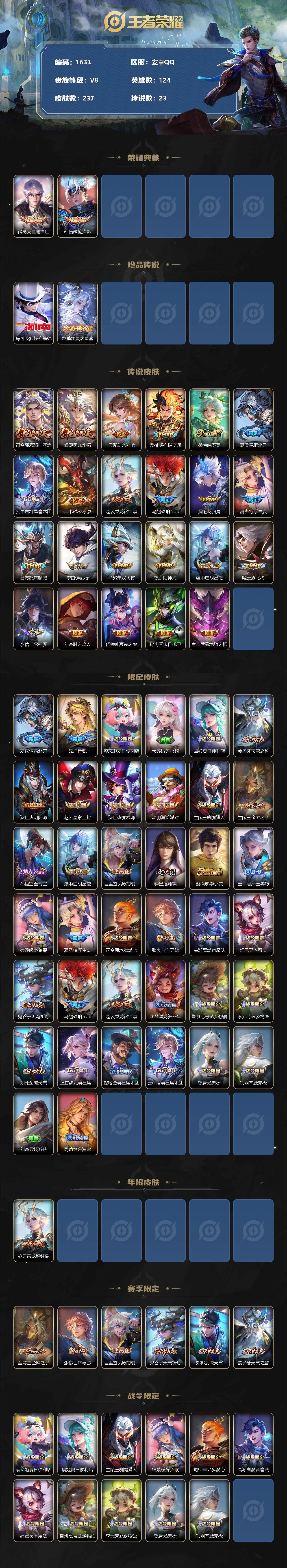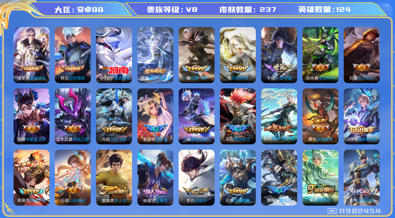 [11982454]【商品标题】:安卓Q-V8-最强王者段位-124英雄-237皮肤-2典藏-0珍品无双-0无双-2珍品传说-23传说-67史诗