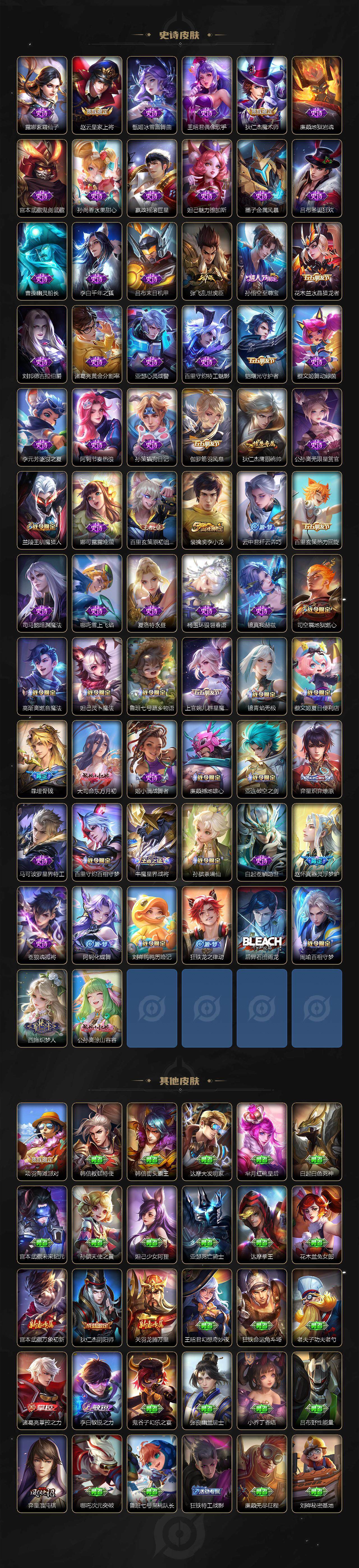 【史诗皮肤】:露娜紫霞仙子,赵云皇家上将,甄姬冰雪圆舞曲,王昭君偶像歌手,狄仁杰魔术师,廉颇地狱岩魂,宫本武藏鬼剑武藏,孙尚香水果甜心,嬴政摇滚巨星,妲己魅力维加斯,墨子金属风暴,吕布圣诞狂欢,曹操幽灵船长,李白千年之狐,吕布末日机甲,张飞乱世虎臣,孙悟空至尊宝,花木兰水晶猎龙者,刘邦德古拉伯爵,诸葛亮黄金分割率,亚瑟心灵战警,百里守约特工魅影,铠曙光守护者,蔡文姬舞动绿茵,李元芳逐浪之夏,阿轲节奏热浪,孙策猫狗日记,伽罗箭羽风息,狄仁杰鹰眼统帅,公孙离无限星赏官,兰陵王驯魔猎人,娜可露露晚萤,百里玄策原