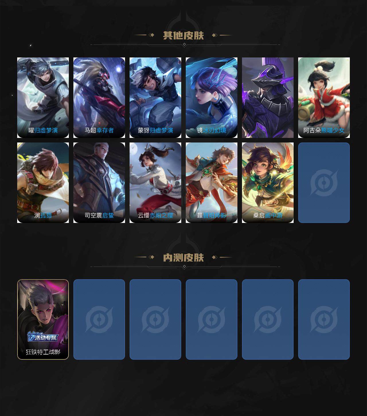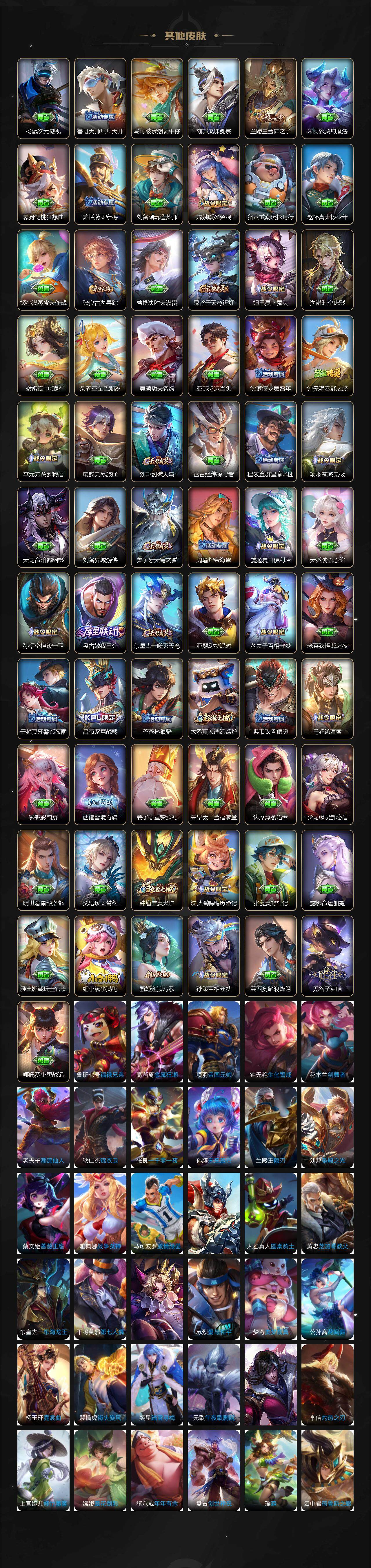 【限定皮肤】:夏侯惇霜北刀,暃埋骨钱,蔡文姬夏日便利店,大乔绒语心约,虞姬夏日便利店,姜子牙天穹之誓,狄仁杰阴阳师,赵云皇家上将,狄仁杰魔术师,项羽海滩派对,兰陵王驯魔猎人,兰陵王金庭之子,孙悟空至尊宝,虞姬启明星使,百里玄策原初追逐者,弈星混沌棋,裴擒虎李小龙,云中君纤云弄巧,嫦娥暖冬兔眠,夏洛特浮生妄,司空震地狱燃心,张良古海寻踪,高渐离燃音魔法,妲己灵卜魔法,鬼谷子天穹祈灯,马超琥珀纪元,赵云乘龙铭钟鼎,沈梦溪龙舞盛年,鲁班七号蔬乡物语,李元芳蔬乡物语,刘邦剑破天穹,上官婉儿群星魔术团,程咬金群星魔术团,云中君群星魔术团,镜青焰无极,项羽苍威无极,刘备异域游侠,周瑜熔金海岸