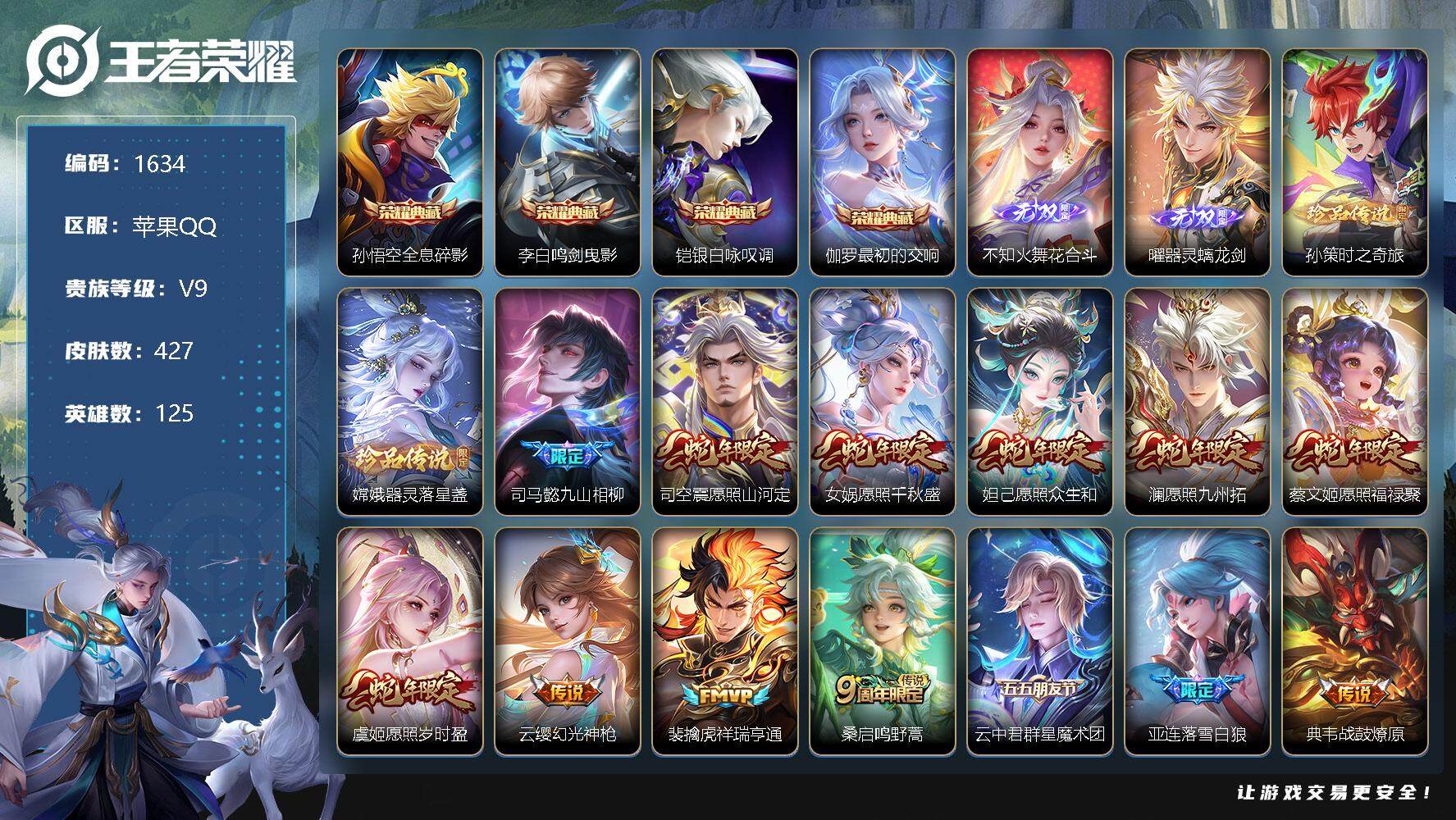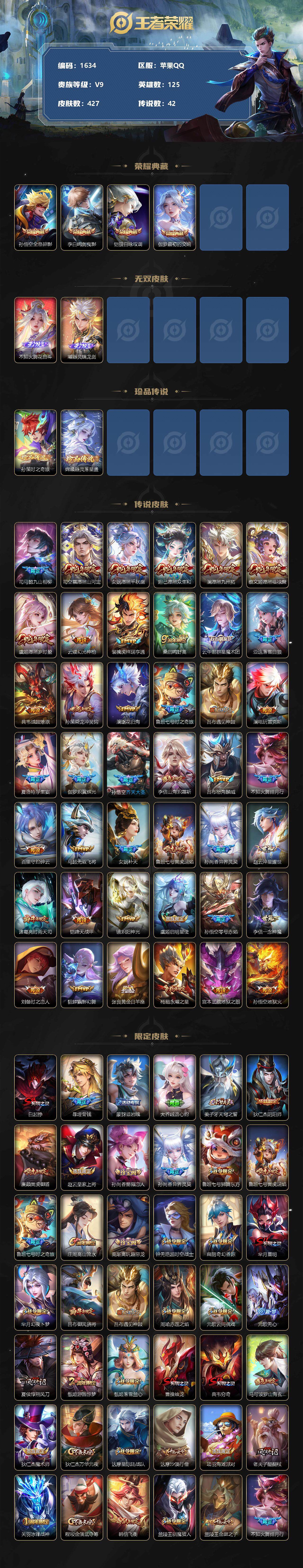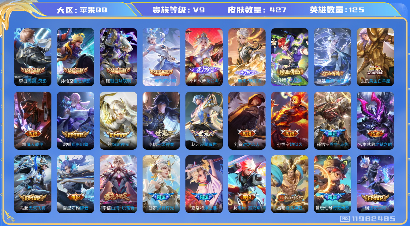 [11982485]【商品标题】:苹果Q-V9-最强王者段位-125英雄-427皮肤-4典藏-0珍品无双-2无双-2珍品传说-42传说-127史诗